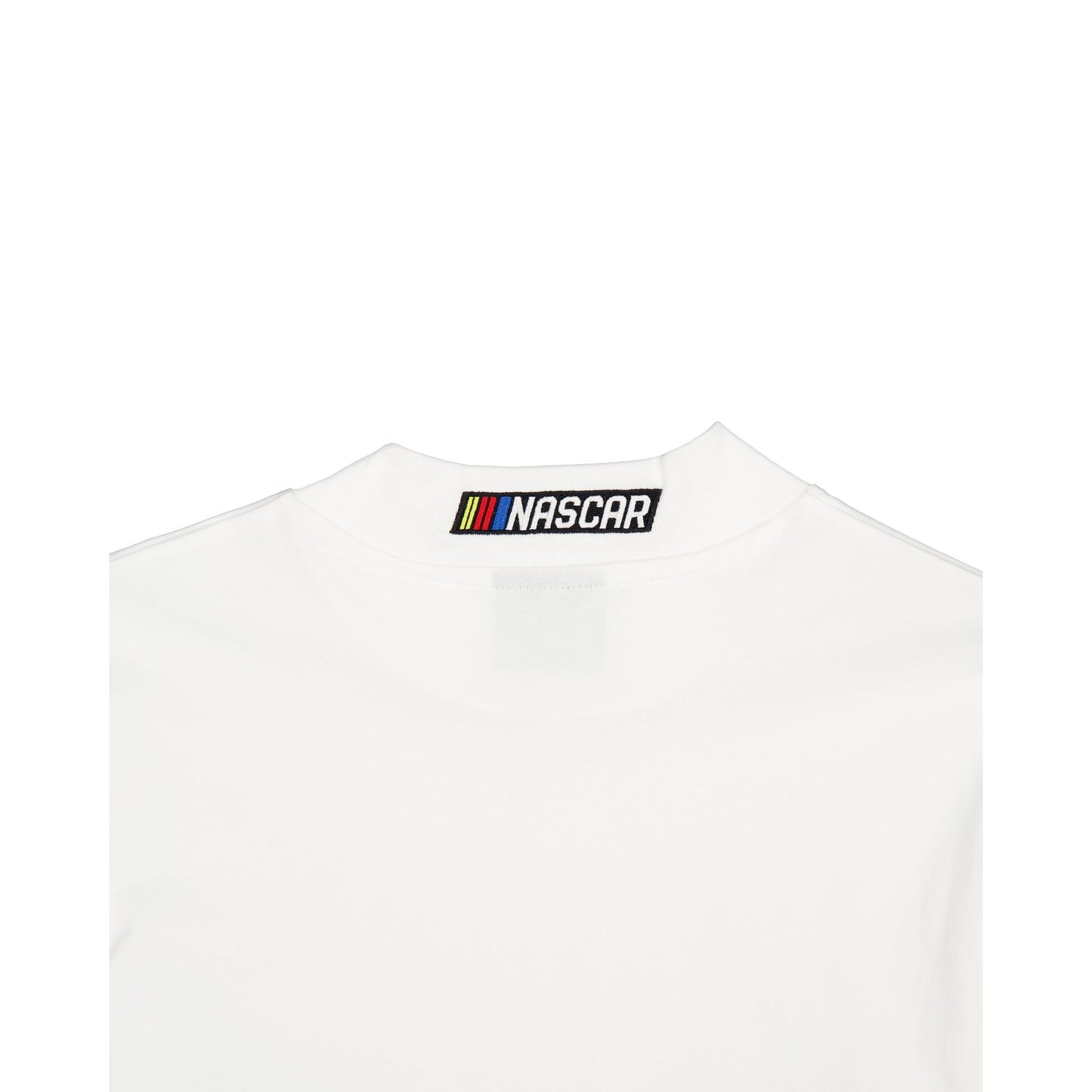 The NASCAR Modern Speed White Long Sleeve T-Shirt features screen-printed NASCAR logos throughout the chest and sleeves with a matching logo embroidered at the rear collar.