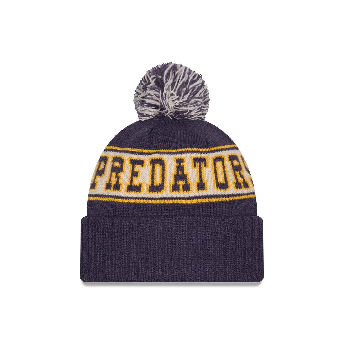 The Nashville Predators Retro Pom Knit Hat features an embroidered Predators logo at the front cuff with a team wordmark at the crown and a one-time removable pom.