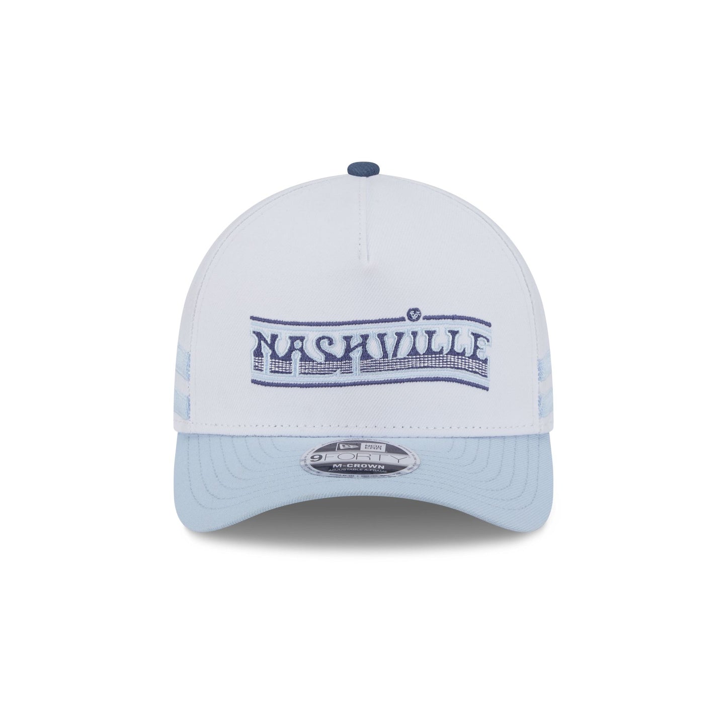 The Nashville SC 2025 Jersey Hook White 9FORTY M-Crown A-Frame Snapback features an embroidered Nashville SC wordmark at the front panels with a field patch at the right-wear side. Additional details include a team logo above a snapback closure at the rear and a blue undervisor.
