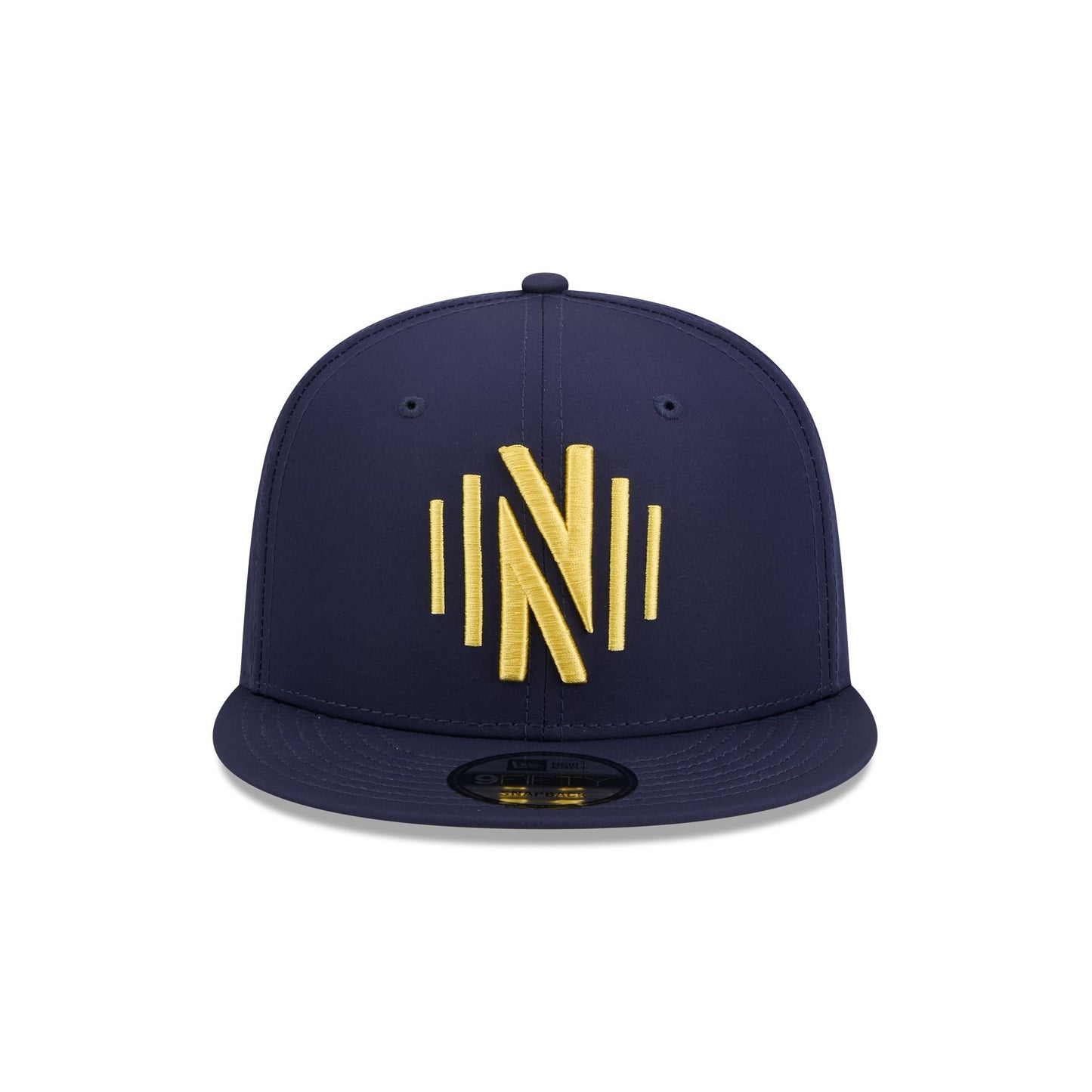 The Nashville SC 2026 Jersey Hook 9FIFTY Snapback features an embroidered Nashville SC logo at the front panels with a team patch at the right-wear side. Additional details include a team graphic above an adjustable snapback closure at the rear.