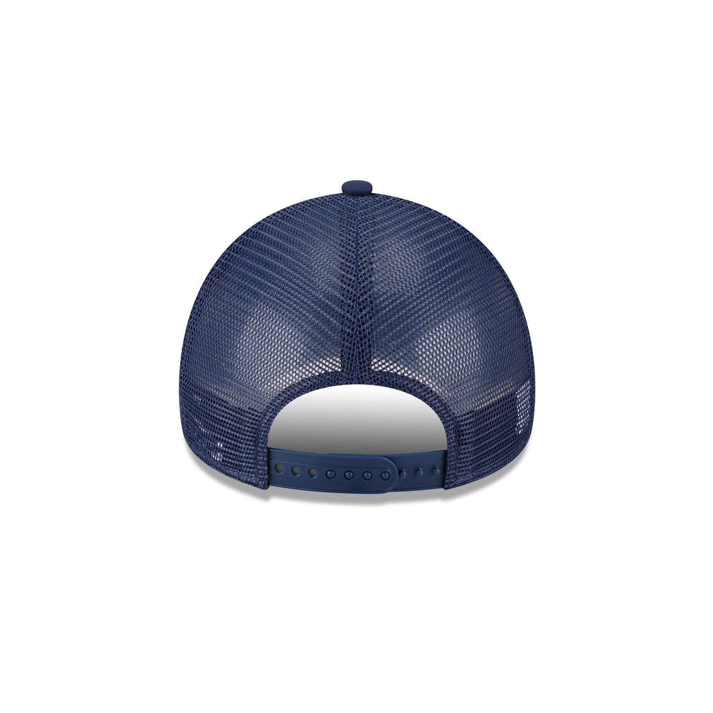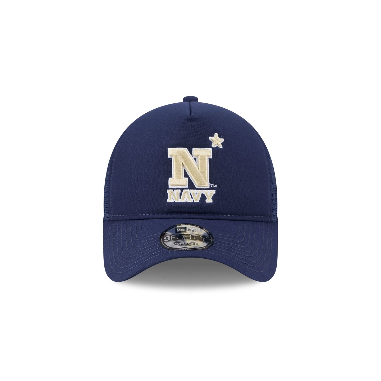 The Navy Midshipmen Go-To 9FORTY A-Frame Trucker features an embroidered Midshipman logo at the front panels with a snapback closure at a mesh rear.
