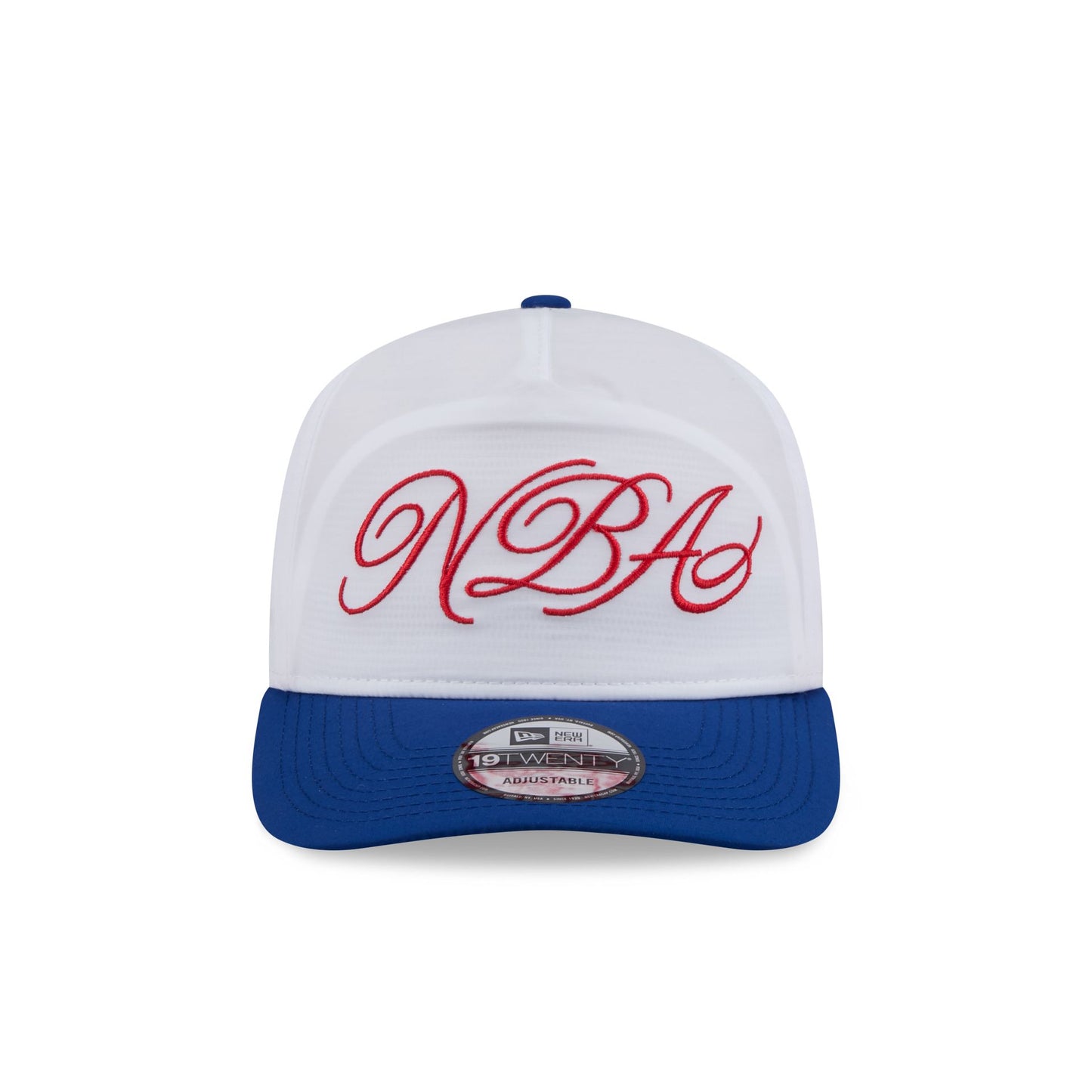 The NBA 2025 Draft 19TWENTY Adjustable Cap features an embroidered NBA script at the front panels with a woven silicone NBA Logoman patch above an adjustable buckle closure at the rear and a gray undervisor. The strap features a National Basketball Association gel print wordmark.