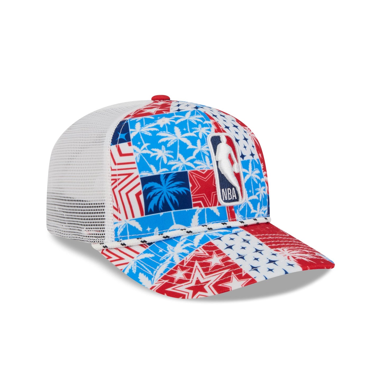 The NBA 2026 All-Star Game Quilt 9SEVENTY Trucker features an embroidered NBA Logoman at the front panels against a team quilt pattern. Additional details include an adjustable stretch-snap closure at a mesh rear and a gray undervisor.