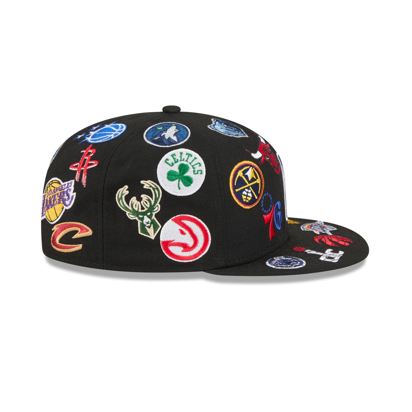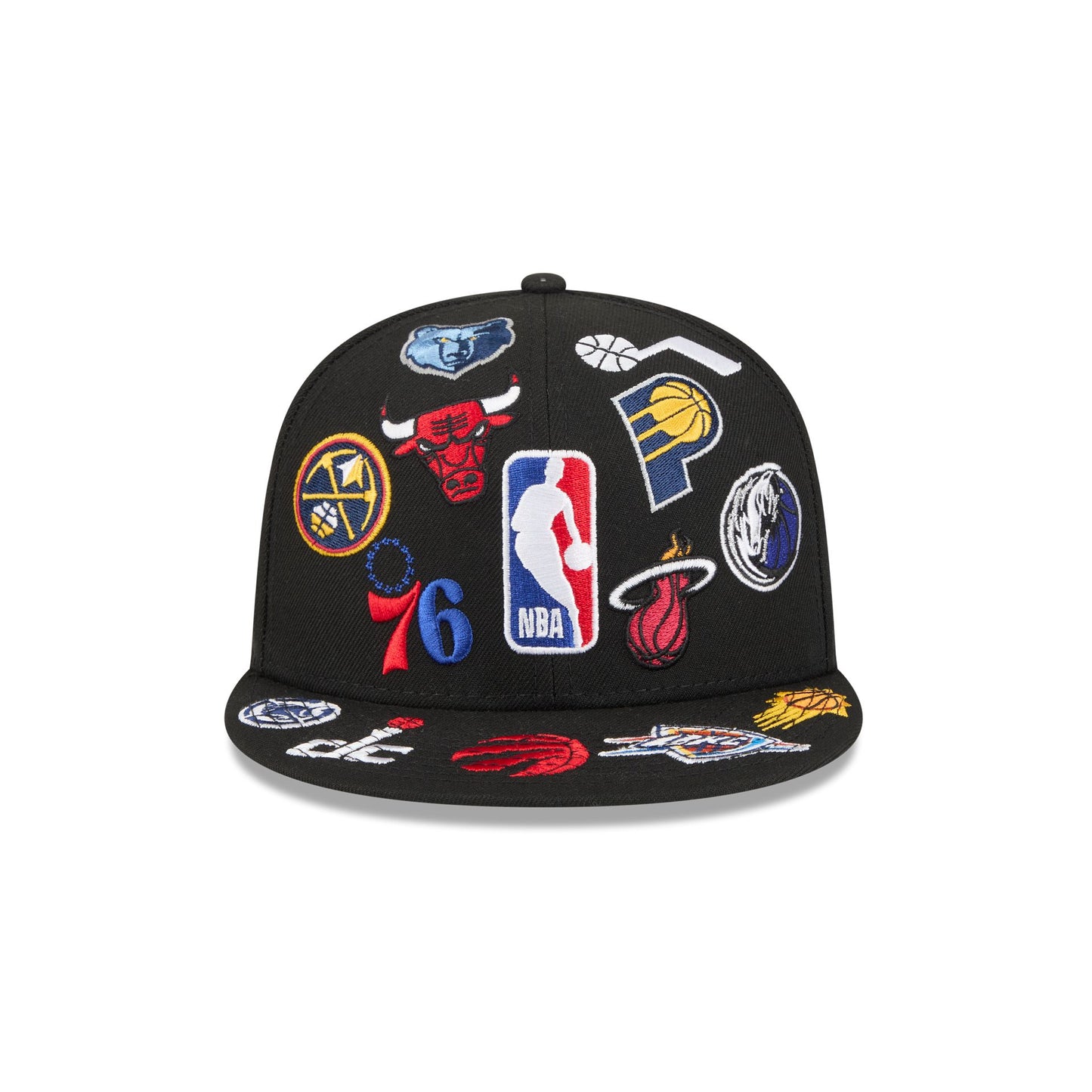 The NBA All Over Logo Black 59FIFTY Fitted Cap features embroidered NBA logos throughout the cap with the NBA Logoman at the front and rear with a gray undervisor.