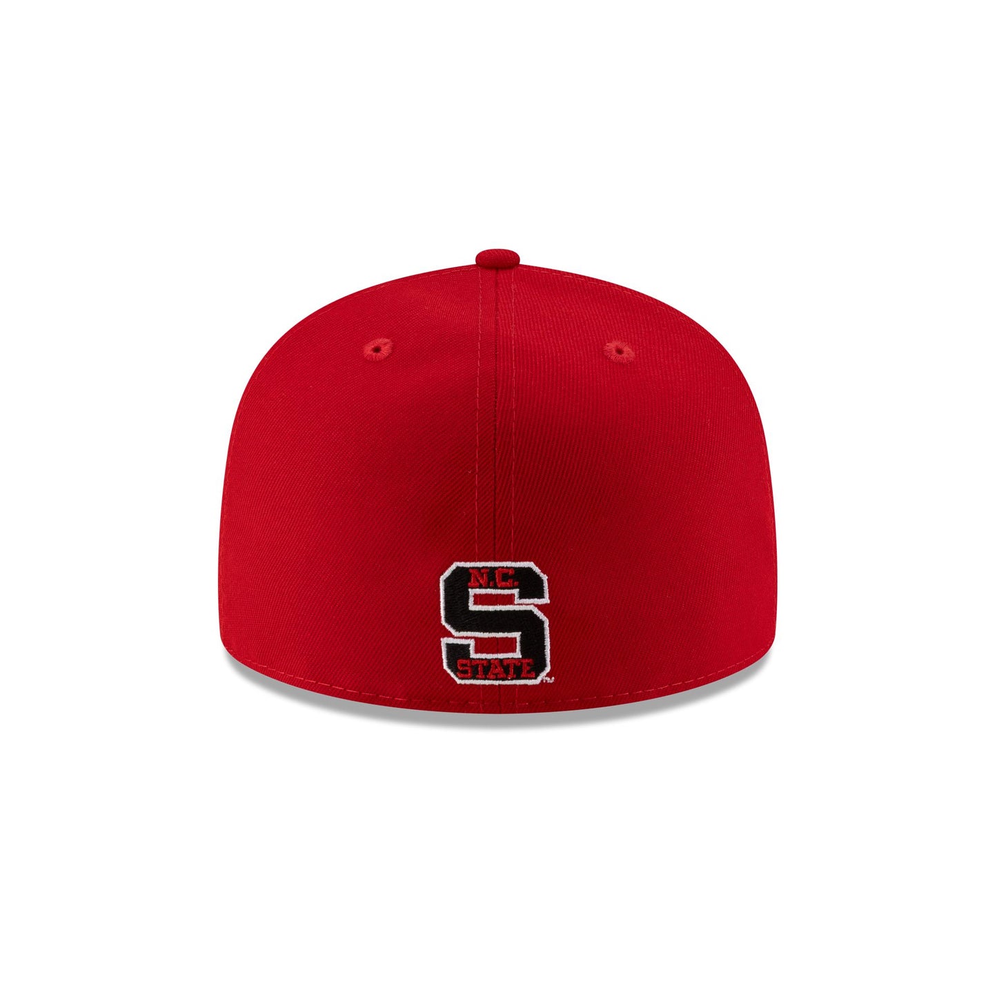 The NC State Wolfpack College Vault Scarlet 59FIFTY Fitted Cap features an embroidered historic NC State Wolfpack logo at the front panels with a historic wordmark at the rear and a green undervisor.