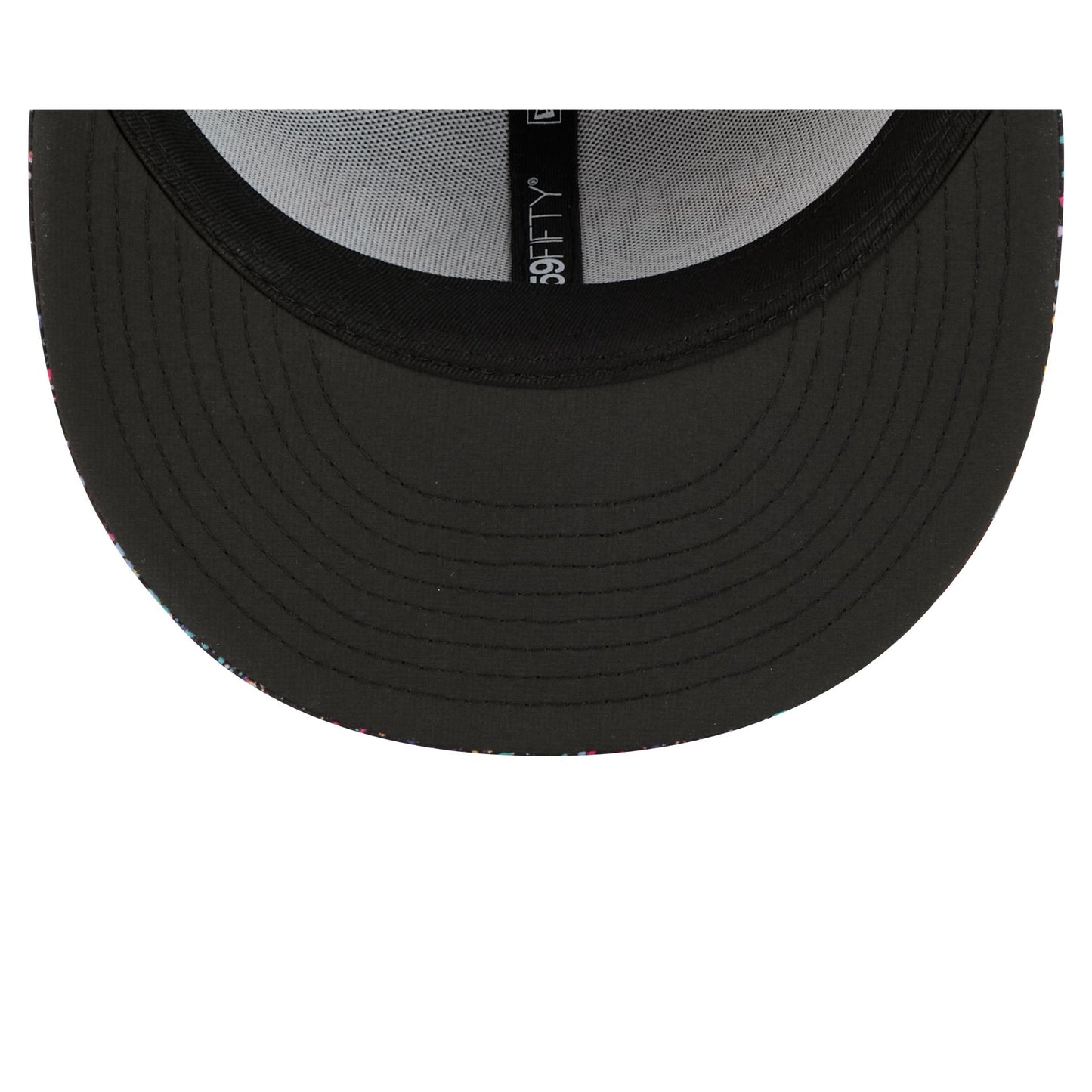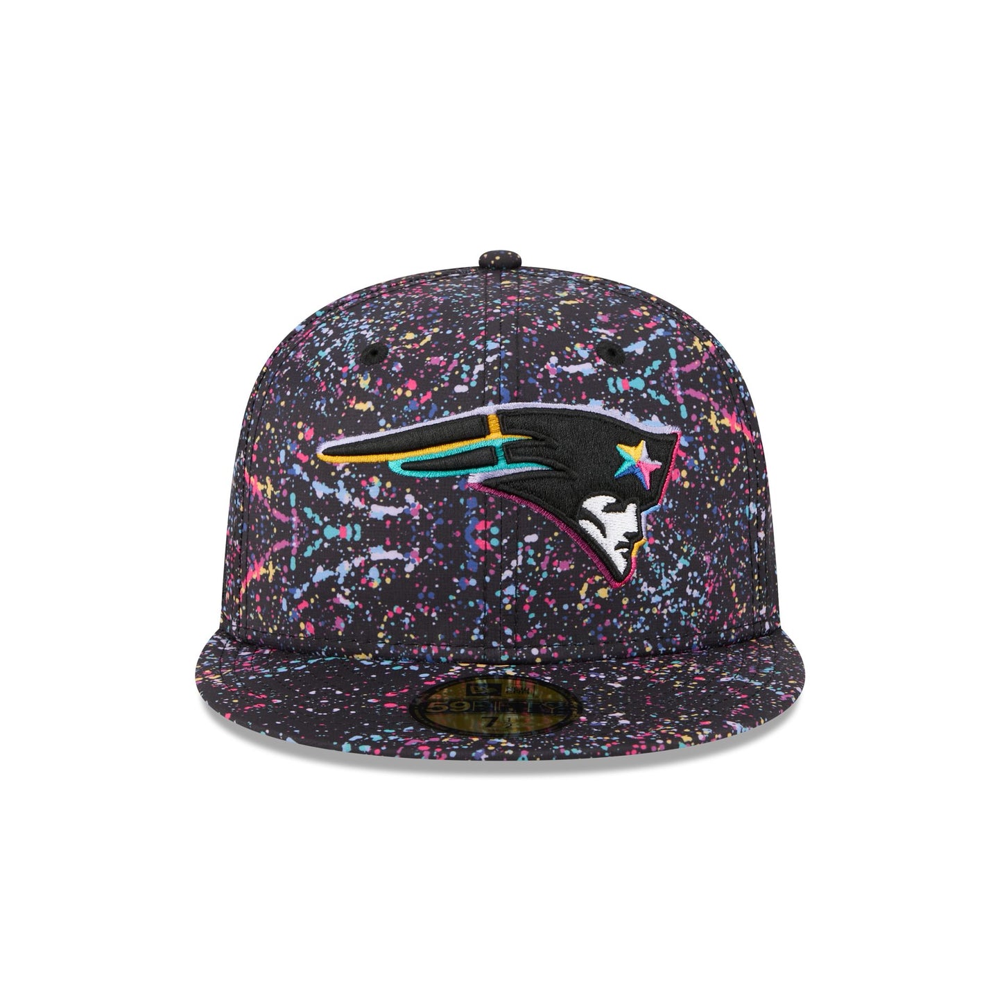 The New England Patriots 2025 Crucial Catch 59FIFTY Fitted Cap features an embroidered Patriots logo at the front paint splatter panels with an NFL Shield at the rear, a Crucial Catch Intercept Cancer patch at the right-wear side, and a black undervisor.