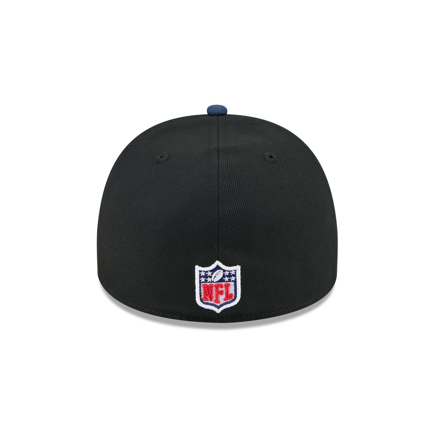 The New England Patriots 2025 Draft Black 59FIFTY Fitted Cap features an embroidered Patriots logo and wordmark at the front panels with a pin at the left. Additional details include an NFL Shield logo at the rear, ornamental stitched details at the visor, and a gray undervisor.