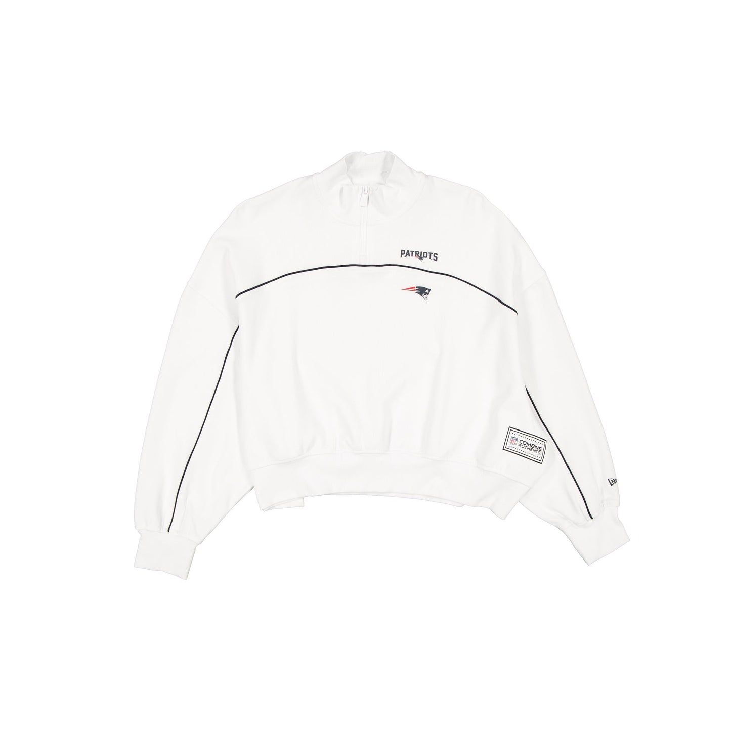 The New England Patriots 2025 Functional Fandom Women's Quarter Zip features a silicone print Patriots logos at the left chest with an Official NFL Combine Authentic patch at the left hip. Additional details include moisture-wicking and antimicrobial fabric with UV protection.
