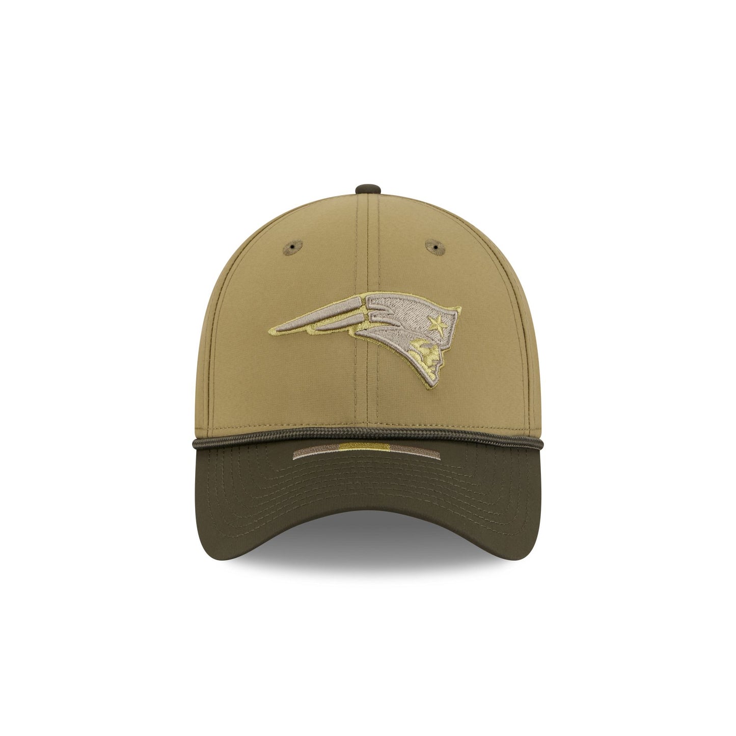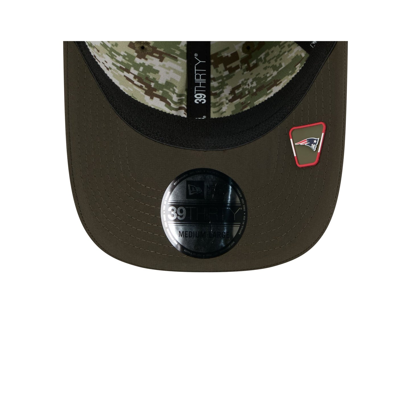 The New England Patriots 2025 Salute to Service 39THIRTY Stretch Fit Cap features an embroidered Patriots logo at the front panels with the official NFL Salute to Service patch at the rear and an American flag patch at the right-wear side. Additional details include three green stripes at the visor with a silicone team logo patch at a dark green undervisor and a digi camo interior fabrication.