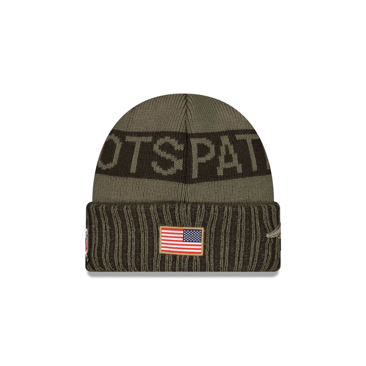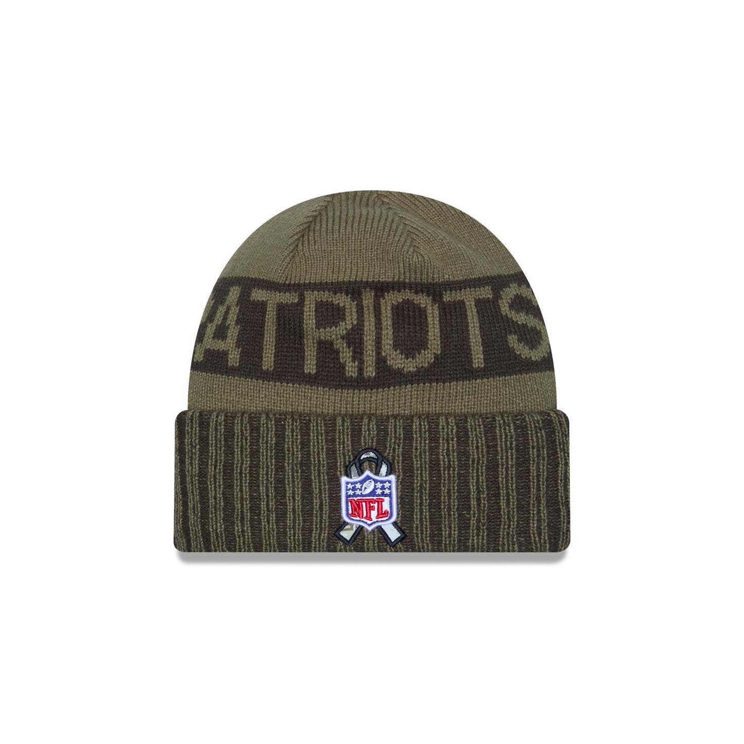 The New England Patriots 2025 Salute to Service Cuff Knit features an embroidered Patriots logo at the front with a team wordmark at the crown, an American flag patch at the right-wear side, and the official NFL Salute to Service patch at the rear.