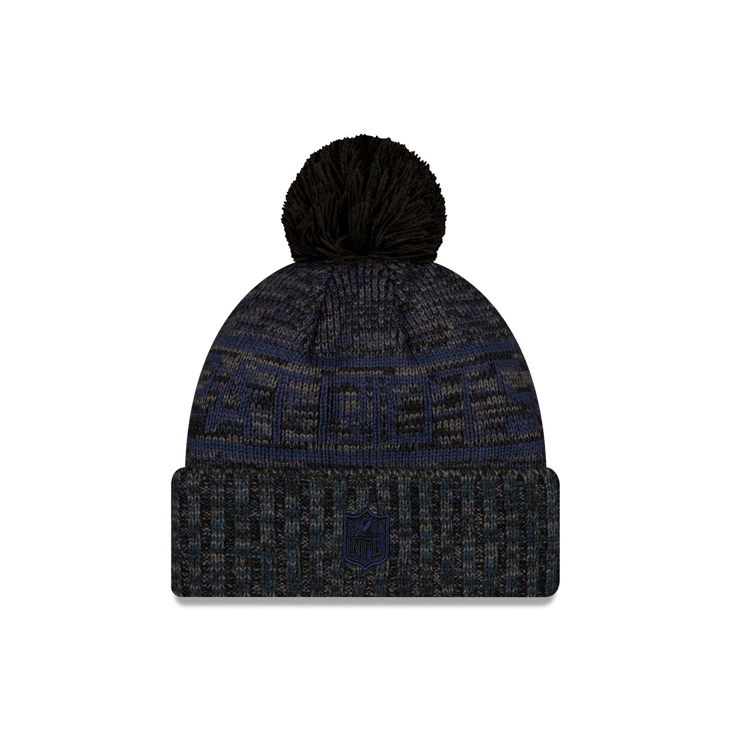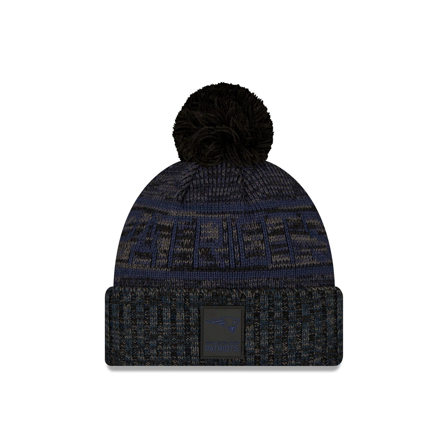 The New England Patriots 2025 Sideline Cold Weather Black Pom Knit Hat features a sewn-down silicone Patriots black logo patch at the front cuff with a matching Official NFL Shield logo at the rear. Additional details include a team wordmark across the crown, a one-time removeable black pom, and a fleece lining.
