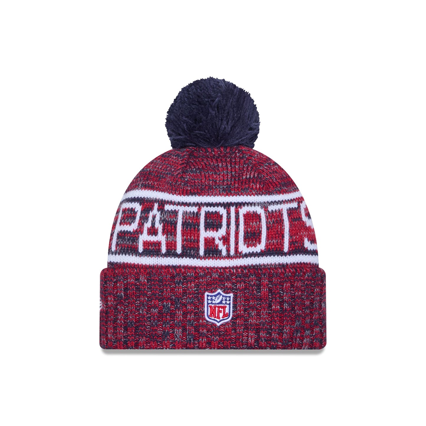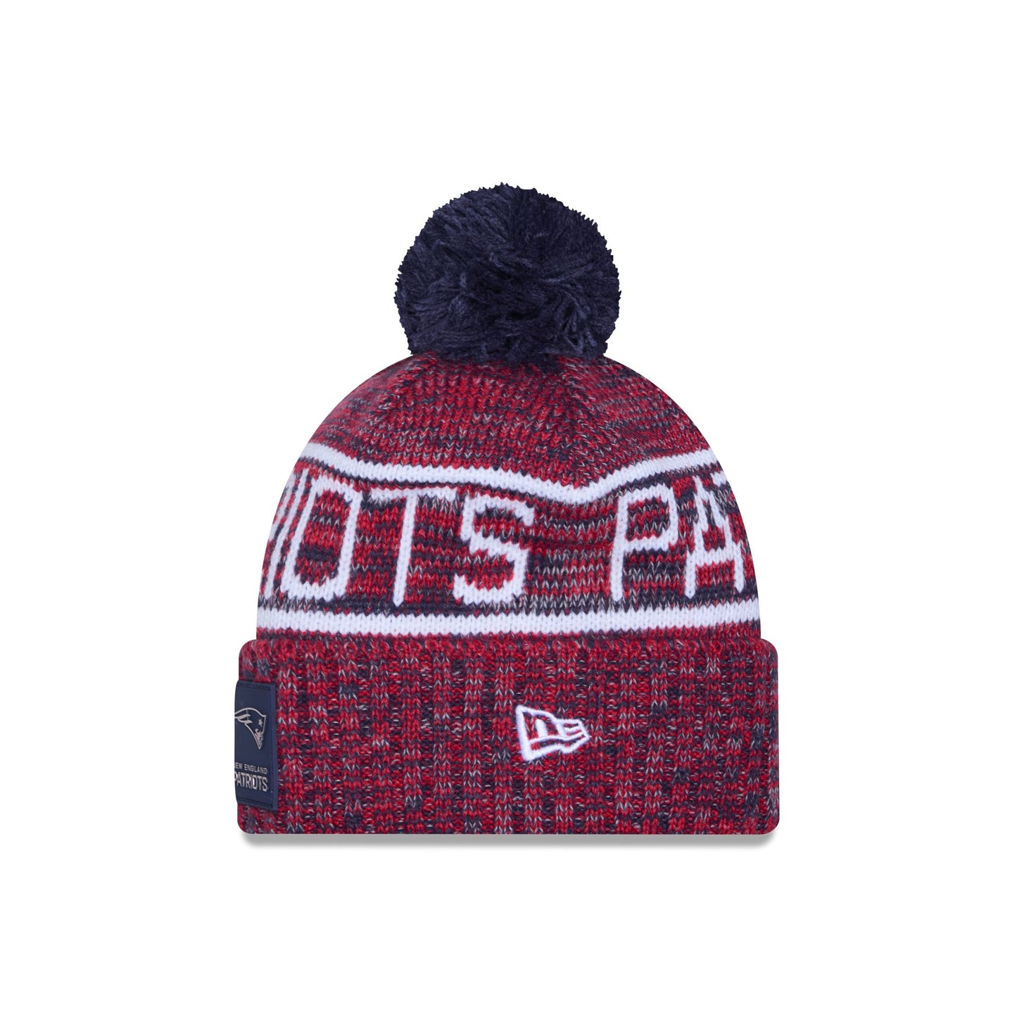 The New England Patriots 2025 Sideline Cold Weather Pom Knit Hat features a sewn-down silicone Patriots logo patch at the front cuff with a matching Official NFL Shield logo at the rear. Additional details include a team wordmark across the crown, a one-time removeable pom, and a fleece lining.