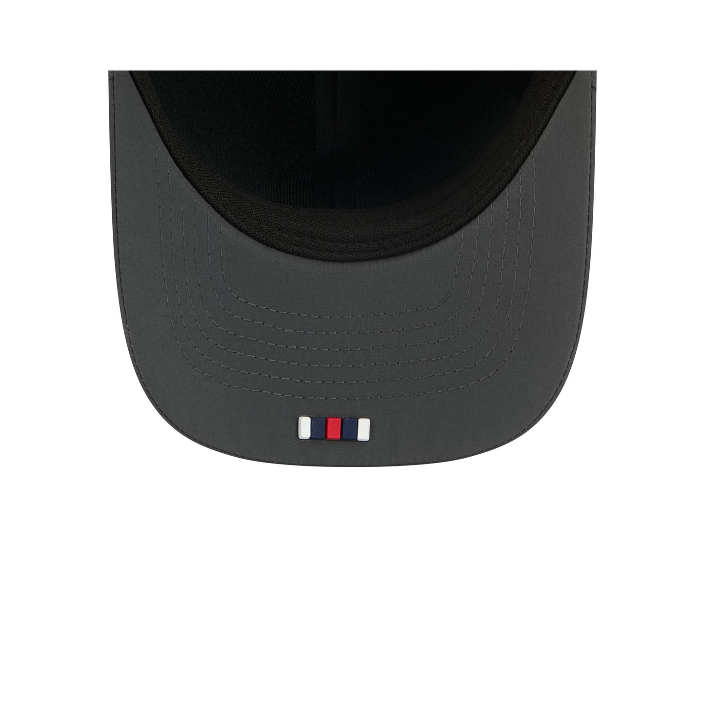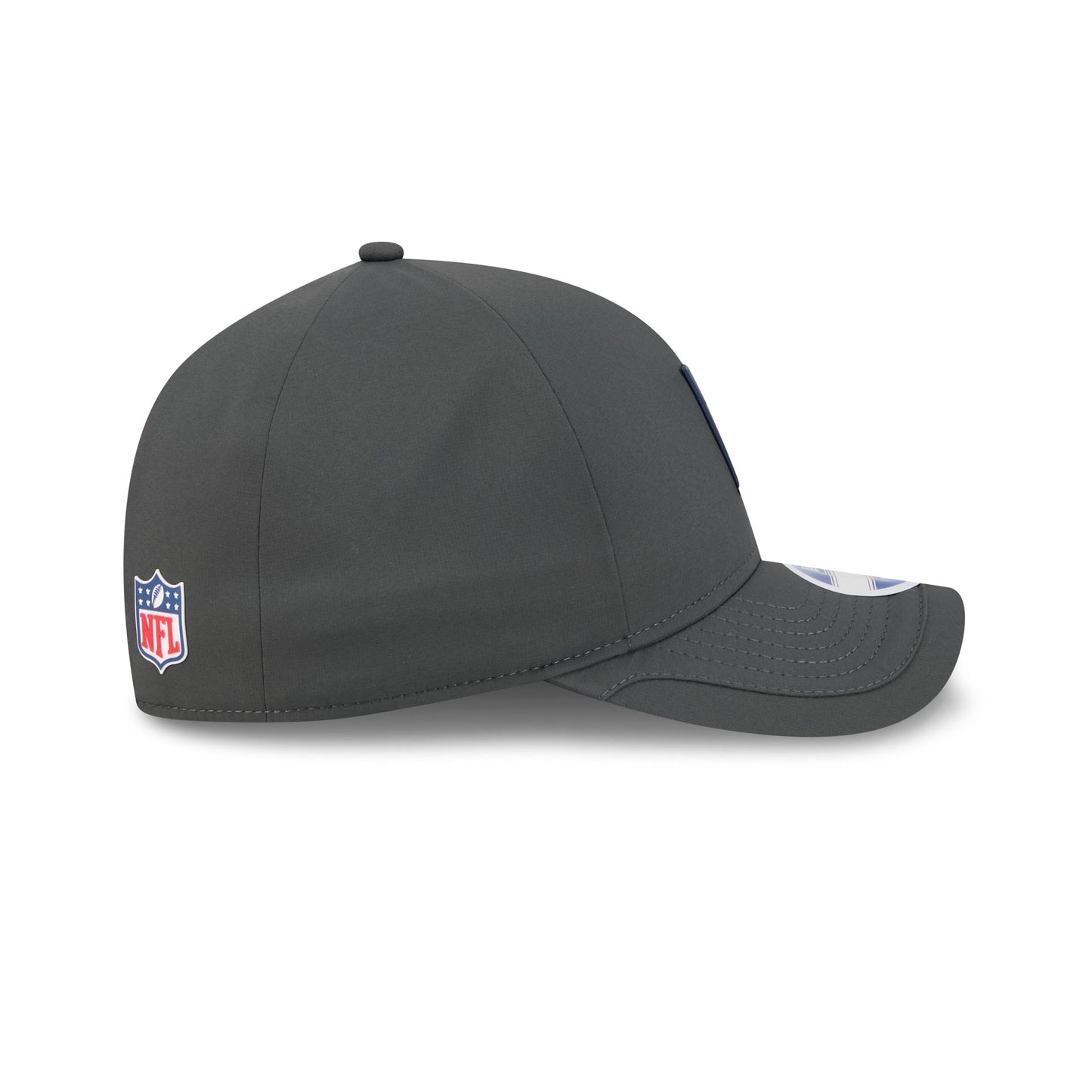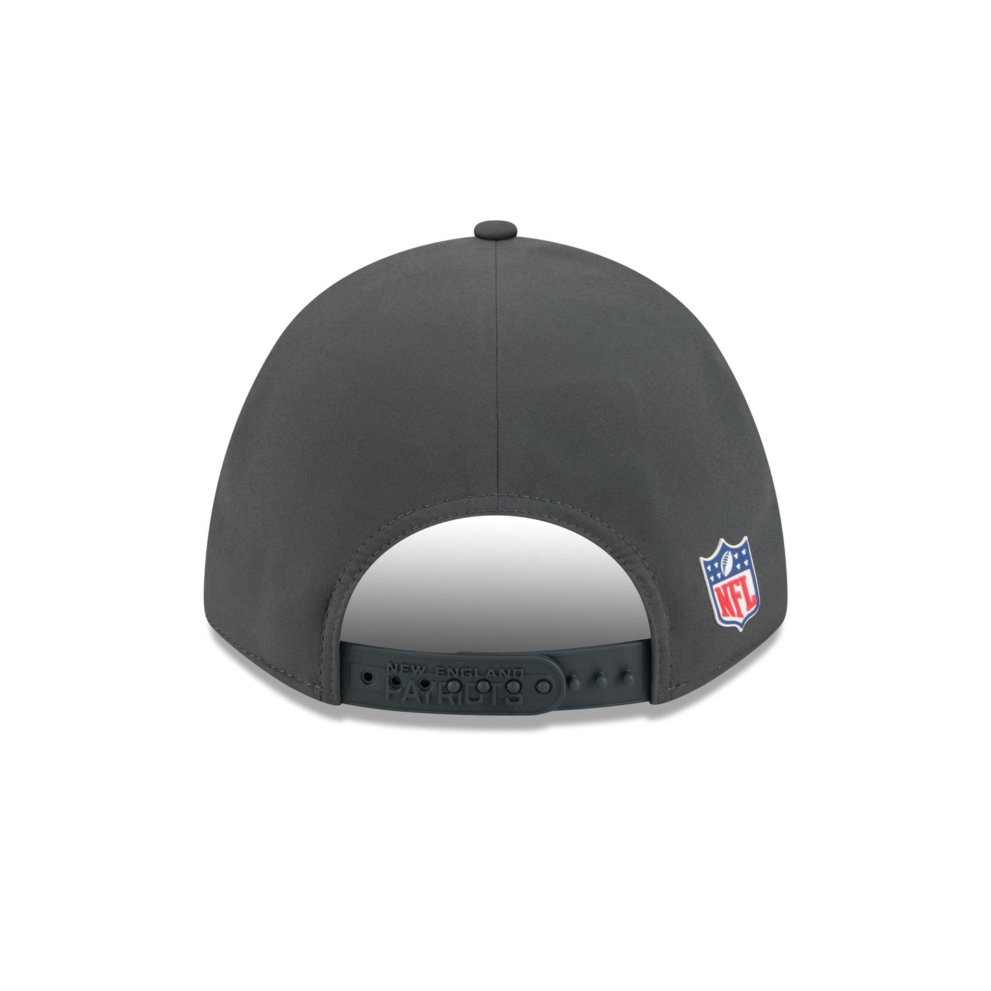 The New England Patriots 2025 Sideline Cold Weather Steel Clouds 9FORTY M-Crown Snapback features a sewn-down silicone Patriots logo patch at the front panels with a water-repellent quill tech fabrication throughout and a quick-dry cushioned sweatband to absorb moisture. Additional details include the Official NFL Shield logo to the right of a soft silicone snapback closure at the rear. The crown has bonded seams to trap warmth and the undervisor is accented with a silicone transfer in the team’s colors.