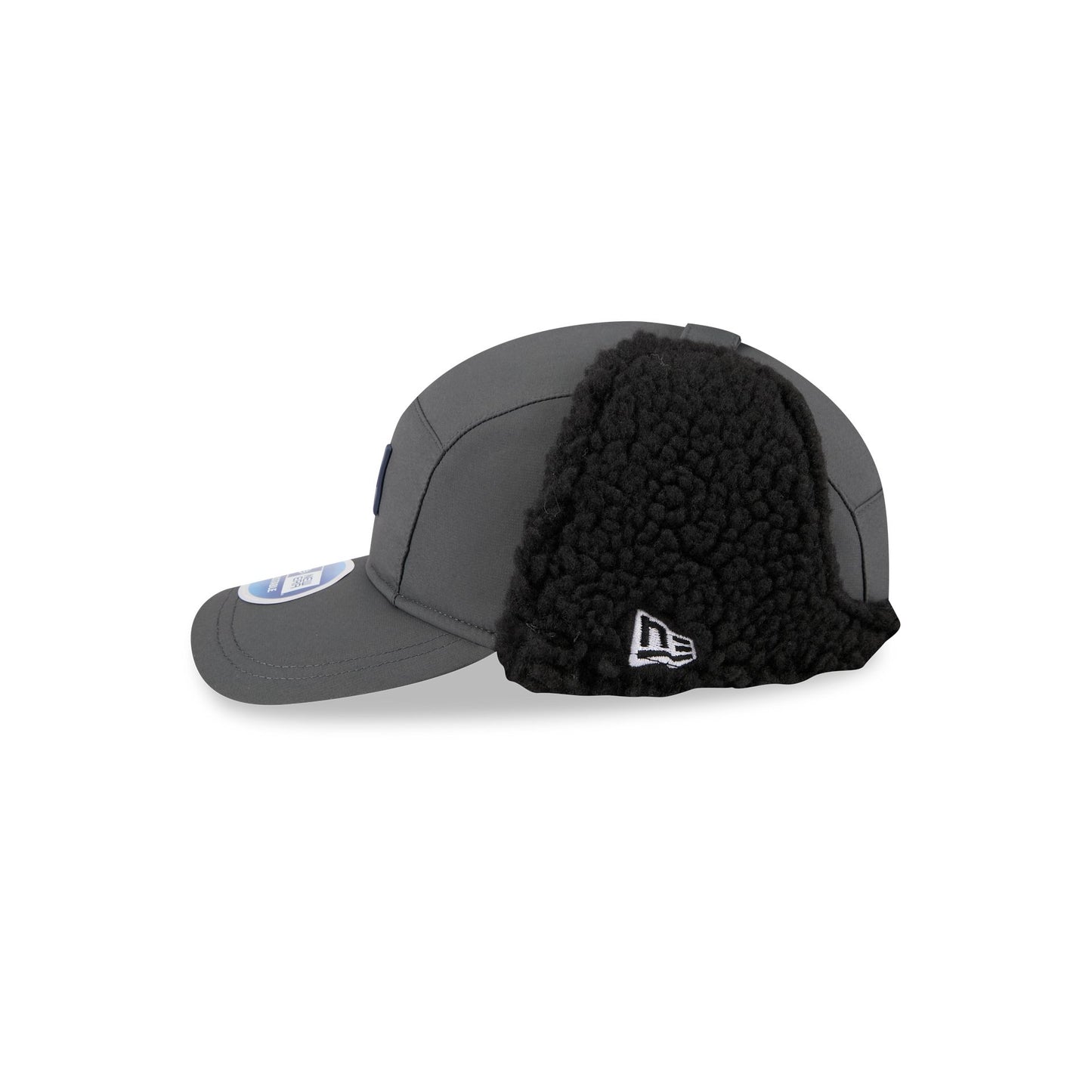 The New England Patriots 2025 Sideline Cold Weather Steel Clouds Runner Dogear Adjustable Cap features a sewn-down silicone Patriots logo patch at the front panels with a water-repellent quill tech fabrication throughout with an insulated crown and sherpa lining. Additional details include a buckle strap button secured at the top of the crown that folds down to cover the ears, and an adjustable elastic toggle at the back for a customizable fit.