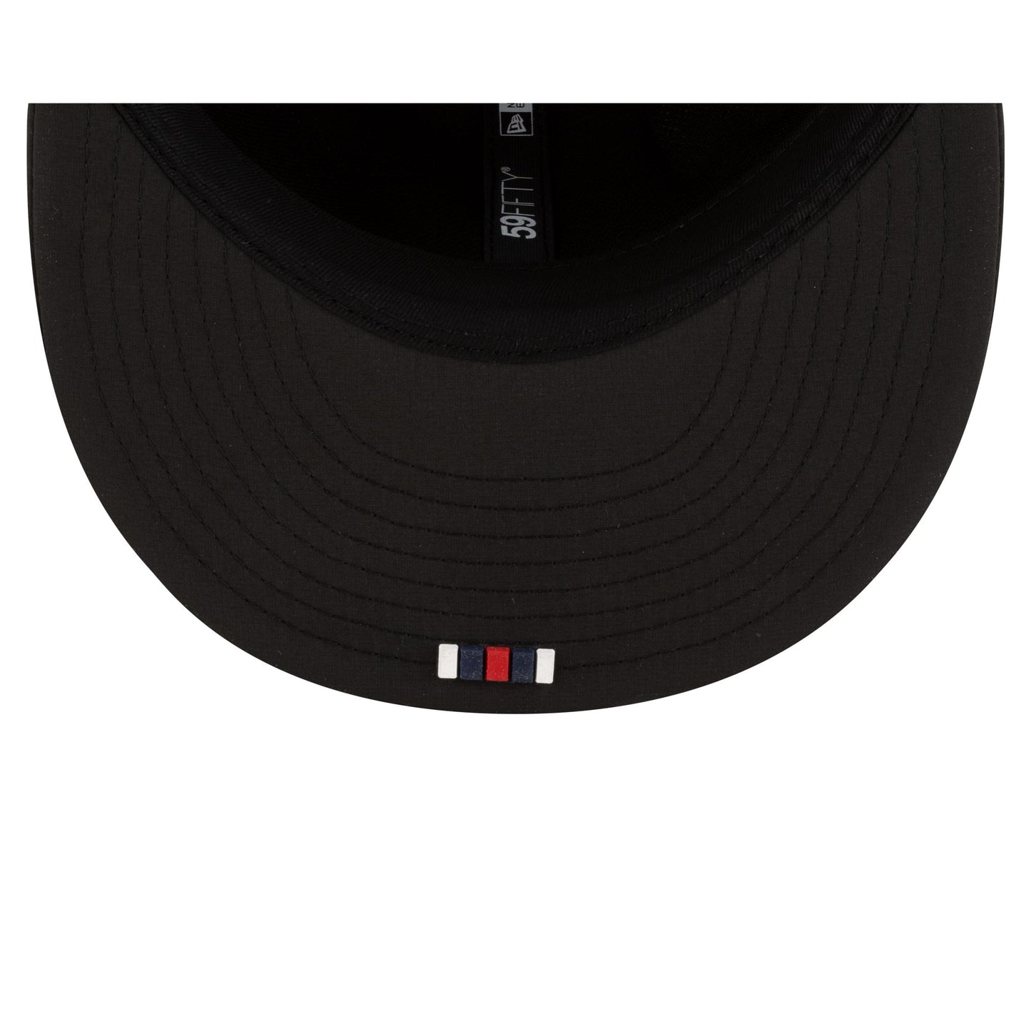 The New England Patriots 2025 Sideline Hot Weather Black 59FIFTY Fitted Cap features a sewn-down silicone Patriots logo patch at the front panels with the Official NFL Shield logo at the rear. The cap has a water-repellent quill tech fabrication throughout, with a quick-dry cushioned sweatband to absorb moisture. The undervisor is accented with a silicone transfer in the team’s colors.
