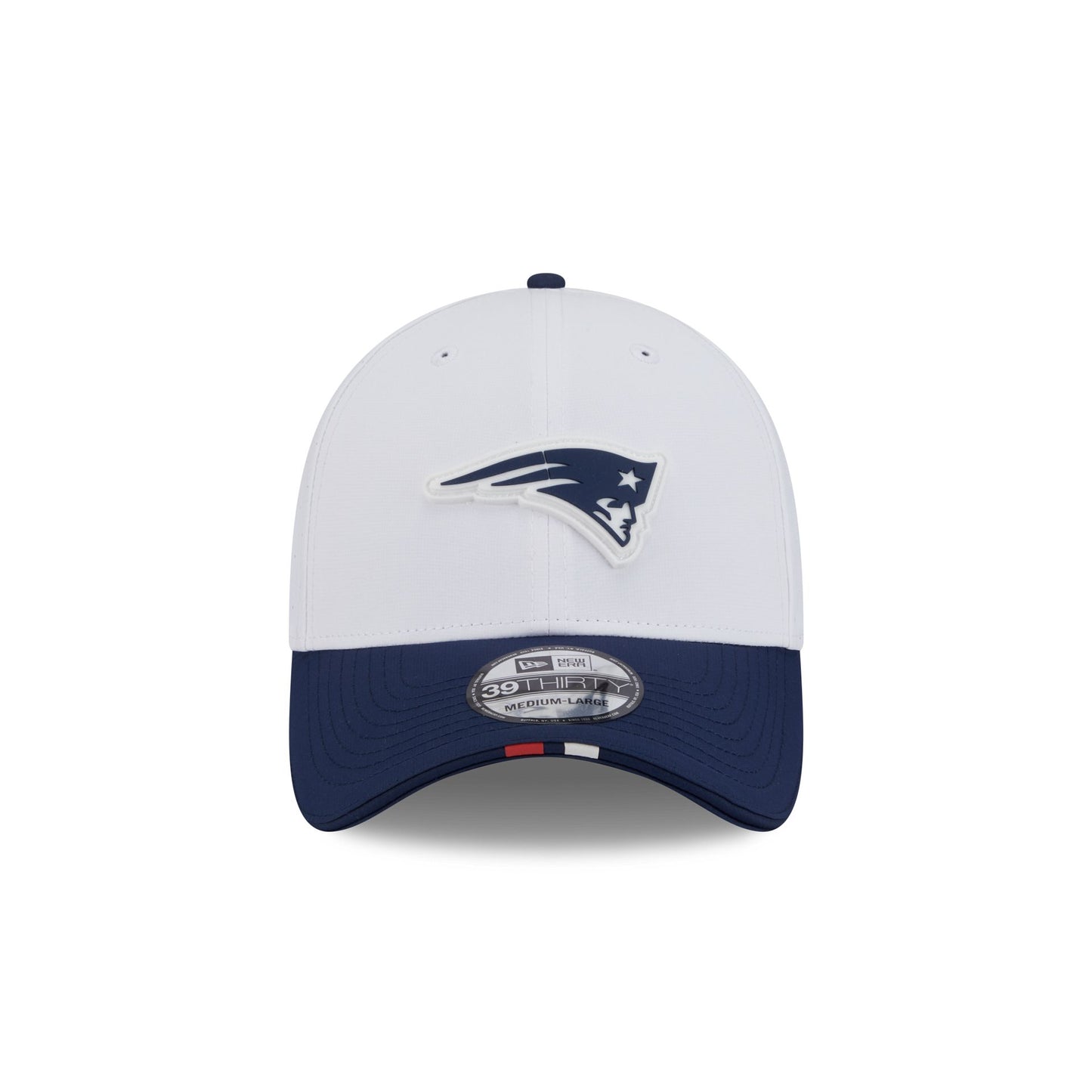 The New England Patriots 2025 Training 39THIRTY Stretch Fit Cap features a silicone Patriots patch at the front panels with team color stripes at the front of a navy visor and a silicone NFL Shield patch at the rear.