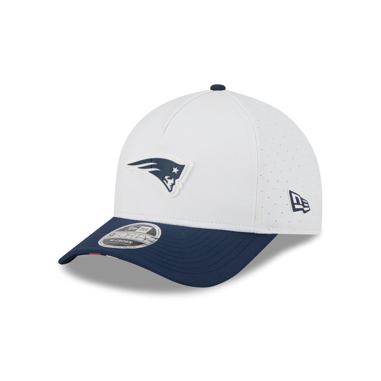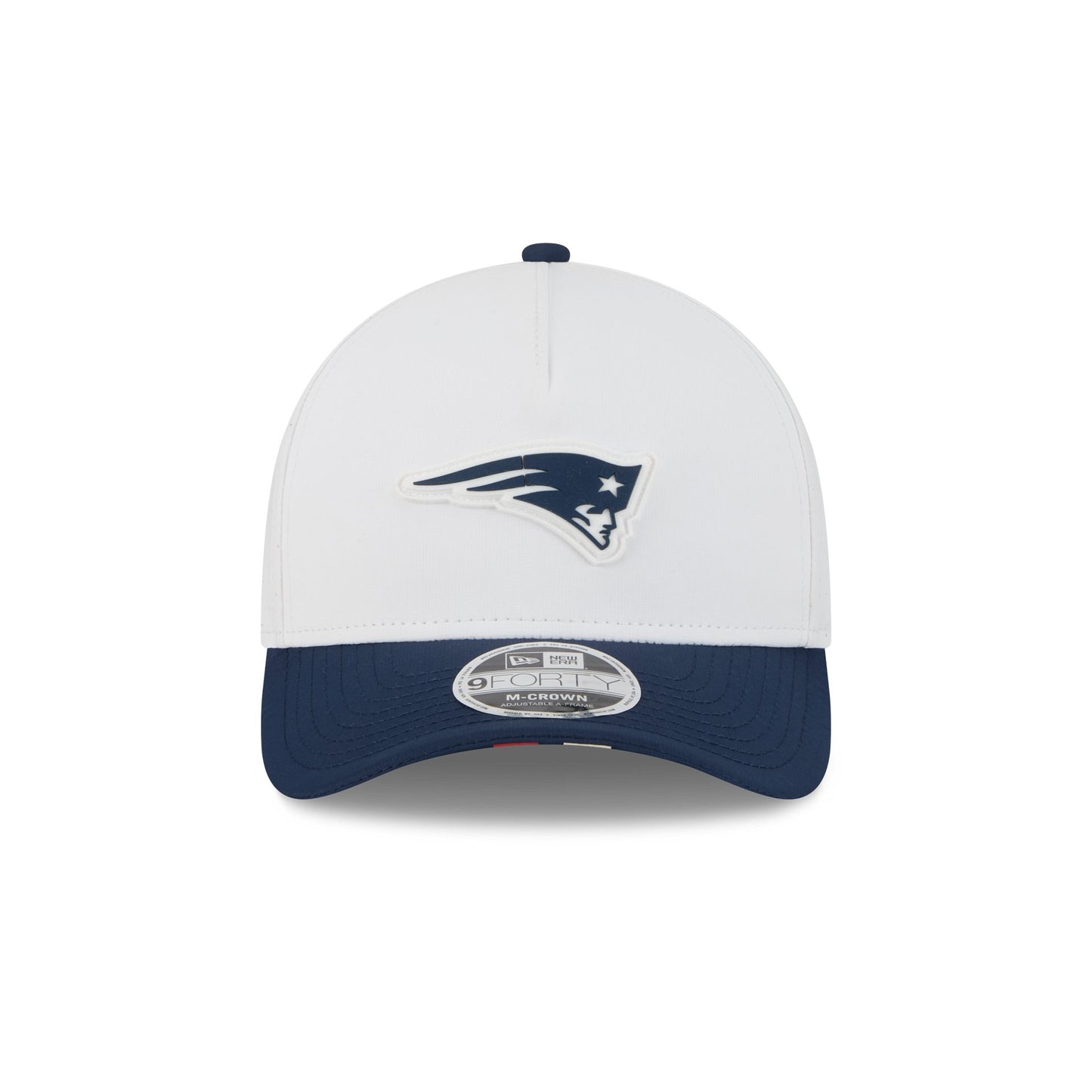 The New England Patriots 2025 Training 9FORTY M-Crown A-Frame Snapback features a silicone Patriots patch at the front panel with team color stripes at the front of a navy visor. Additional details include a silicone NFL Shield patch on a woven foldover tab above a snapback closure at the rear.