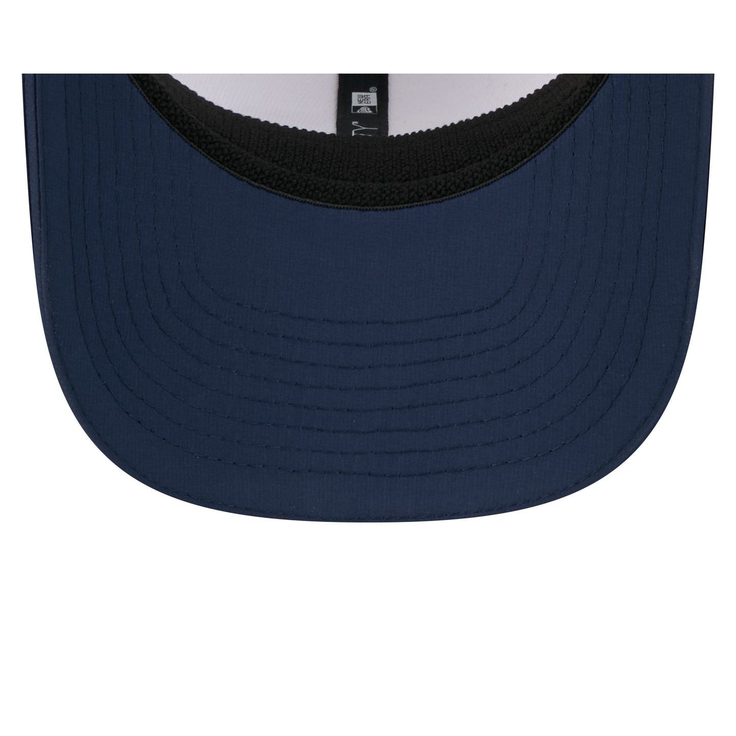 The New England Patriots 2025 Training 9SEVENTY Stretch-Snap Cap features a silicone Patriots patch at the front panels with team color stripes at the front of a navy visor. Additional details include a silicone NFL Shield patch on a woven foldover tab above a snapback closure at the rear.
