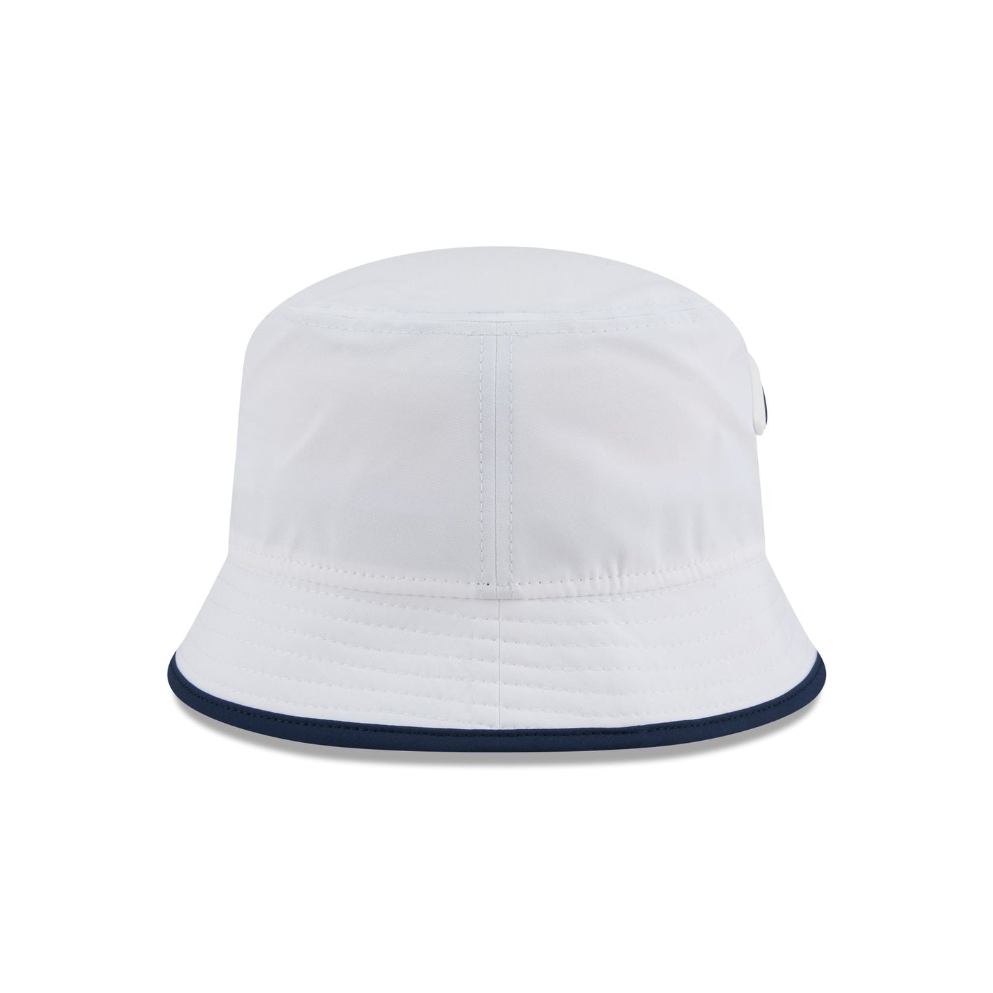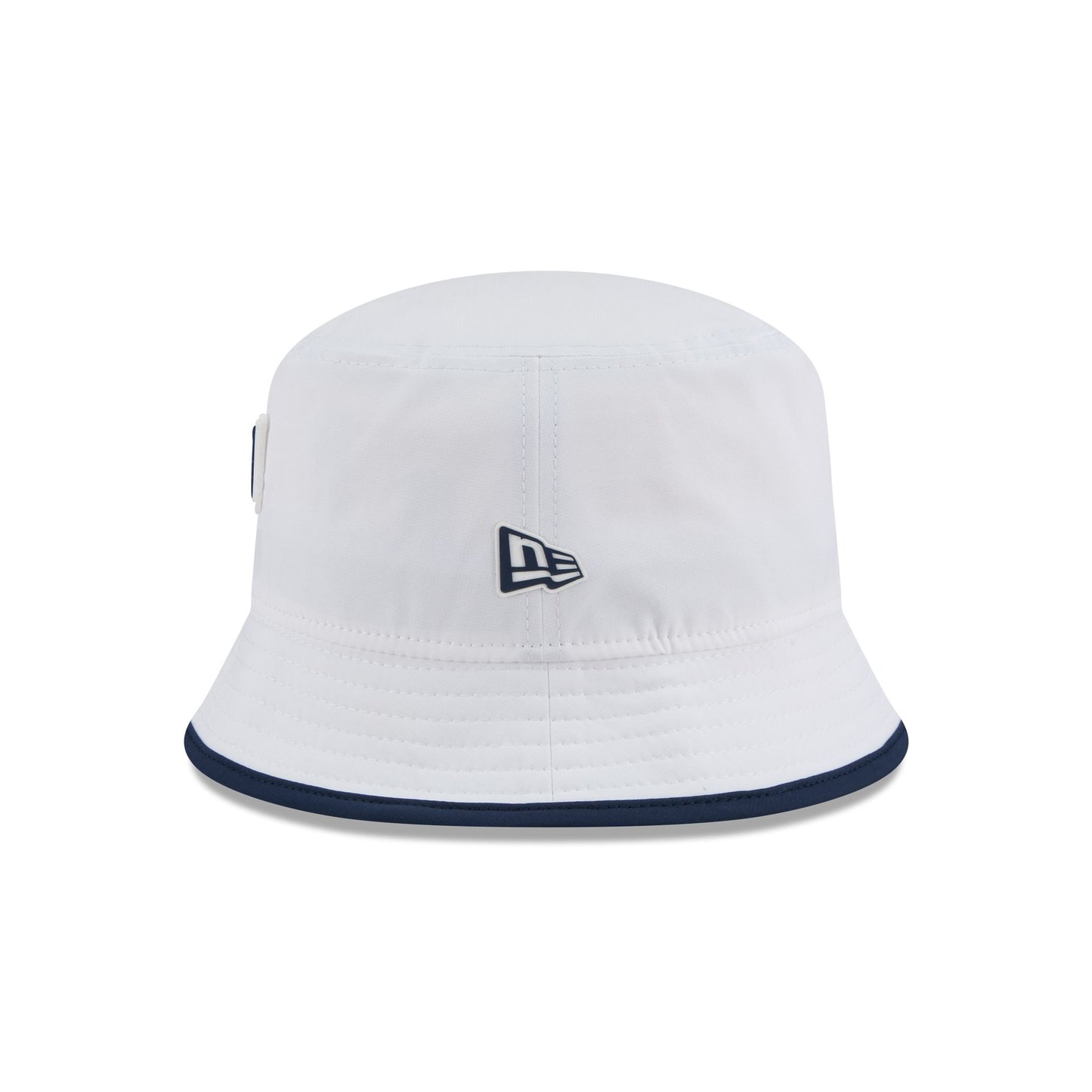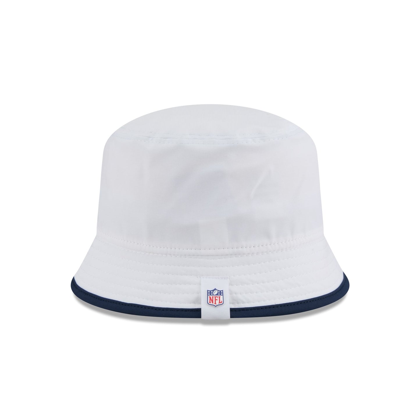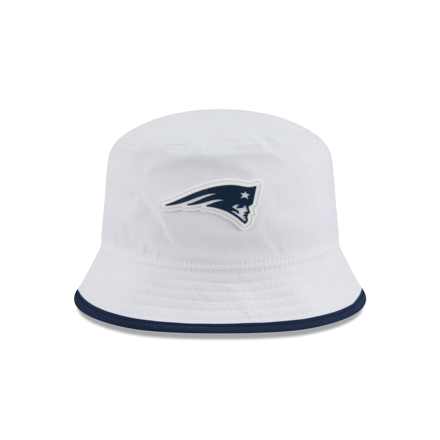 The New England Patriots 2025 Training Bucket Hat features a silicone Patriots patch at the front panel with team color piping along the edge and a silicone NFL Shield patch on a woven foldover tab at the rear.