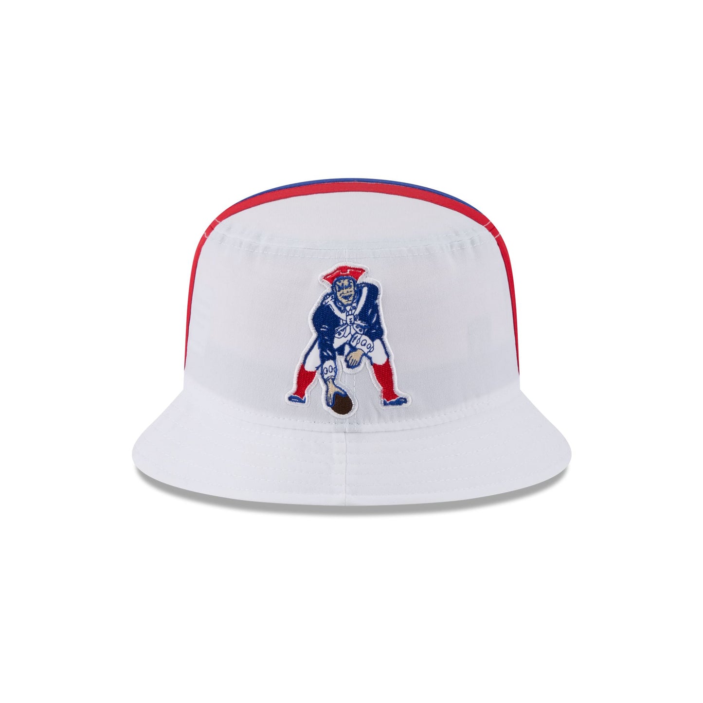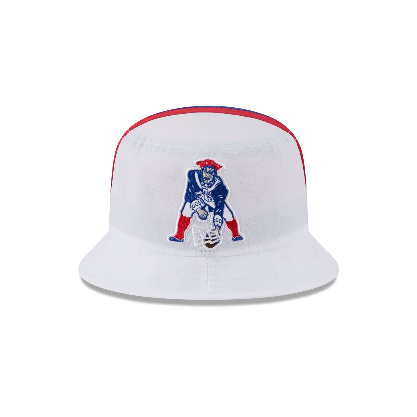 The New England Patriots Historic Helmet Bucket Hat features an embroidered Patriots helmet design throughout.
