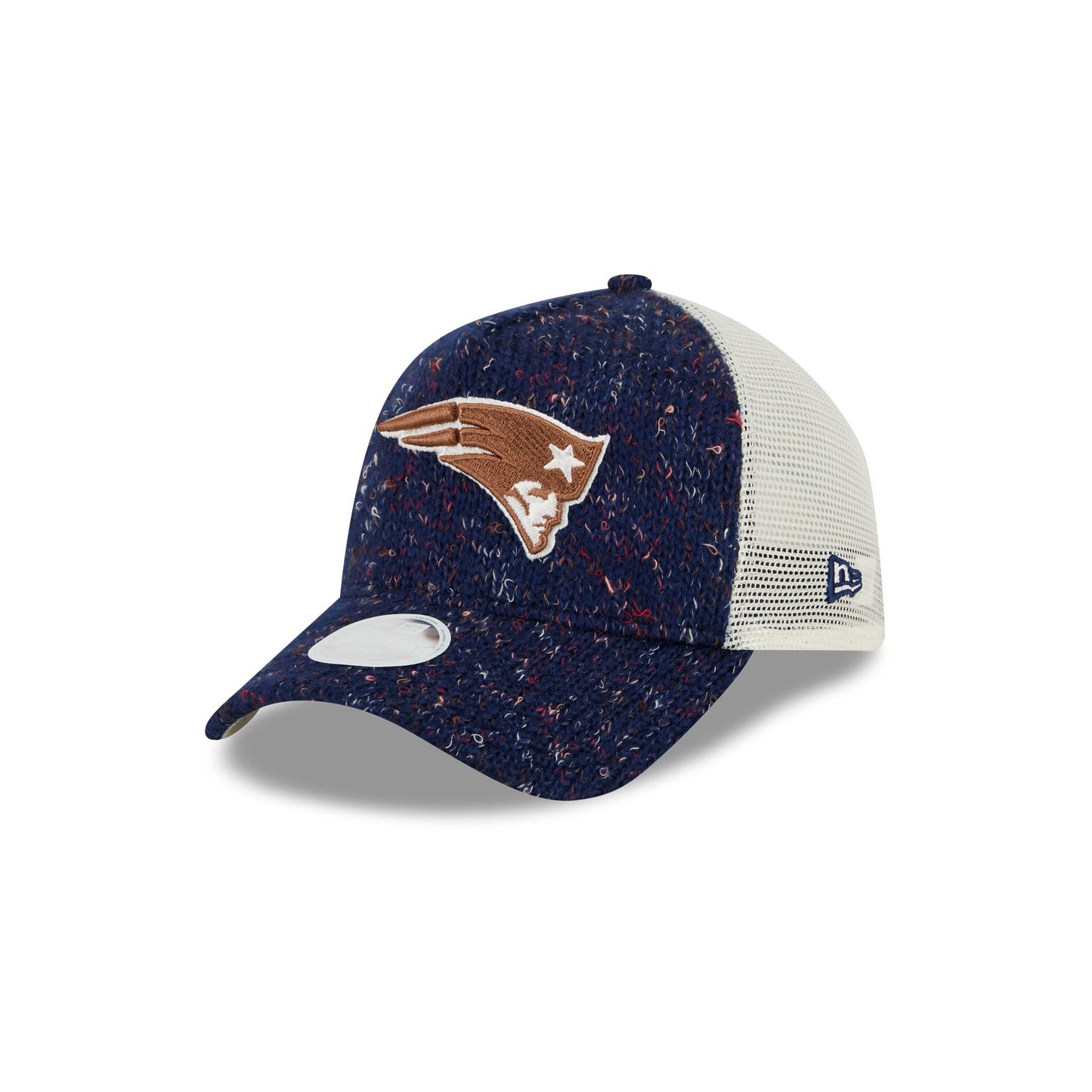 The New England Patriots Knit Women's 9FORTY A-Frame Trucker features an embroidered Patriots logo at the front knit panels. Additional details include a snapback closure at a mesh rear and white undervisor.