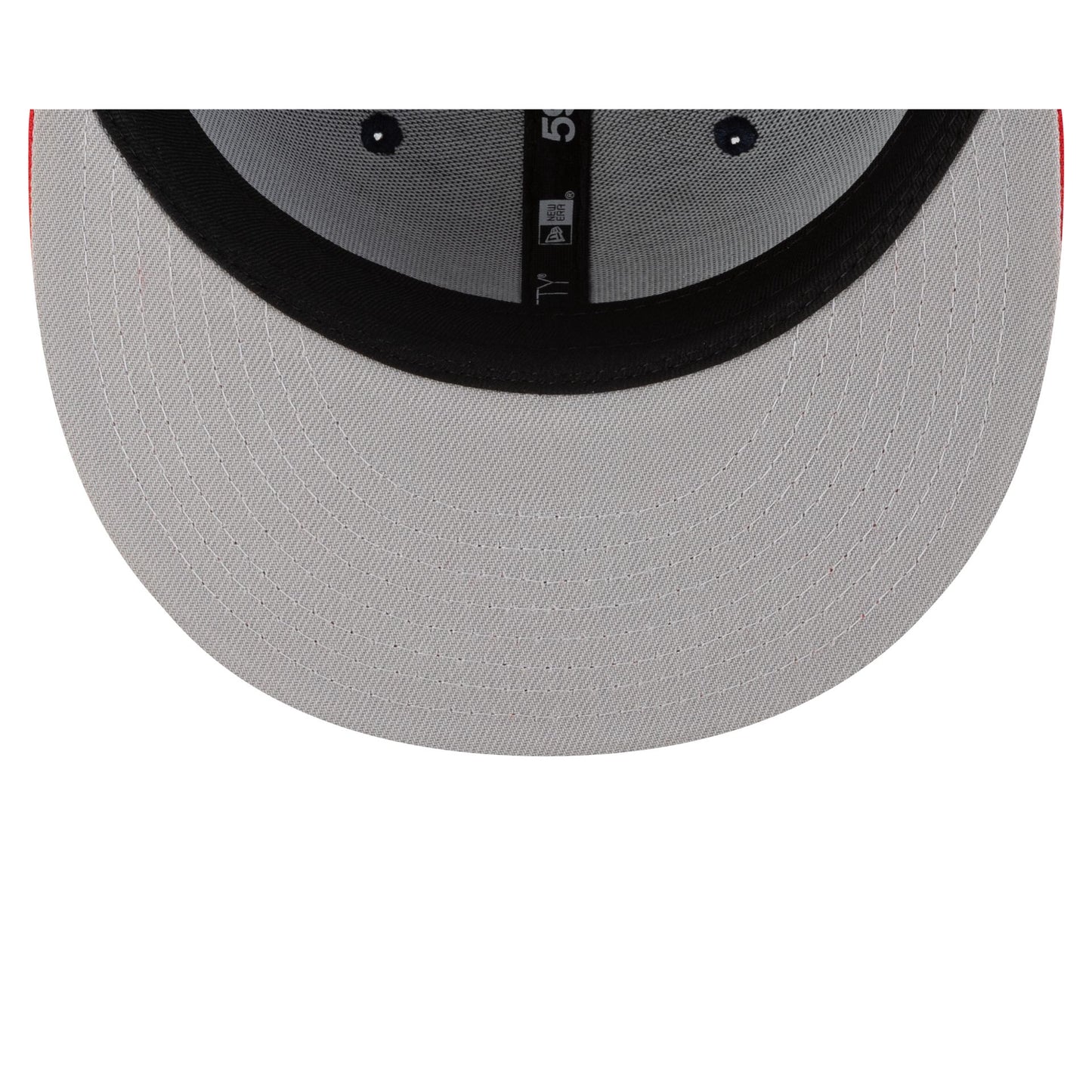 The New England Patriots Mascot 59FIFTY Fitted Cap features an embroidered Patriots mascot at the front panels with a matching NFL Shield at the rear, a team logo at the right-wear side, and a gray undervisor.