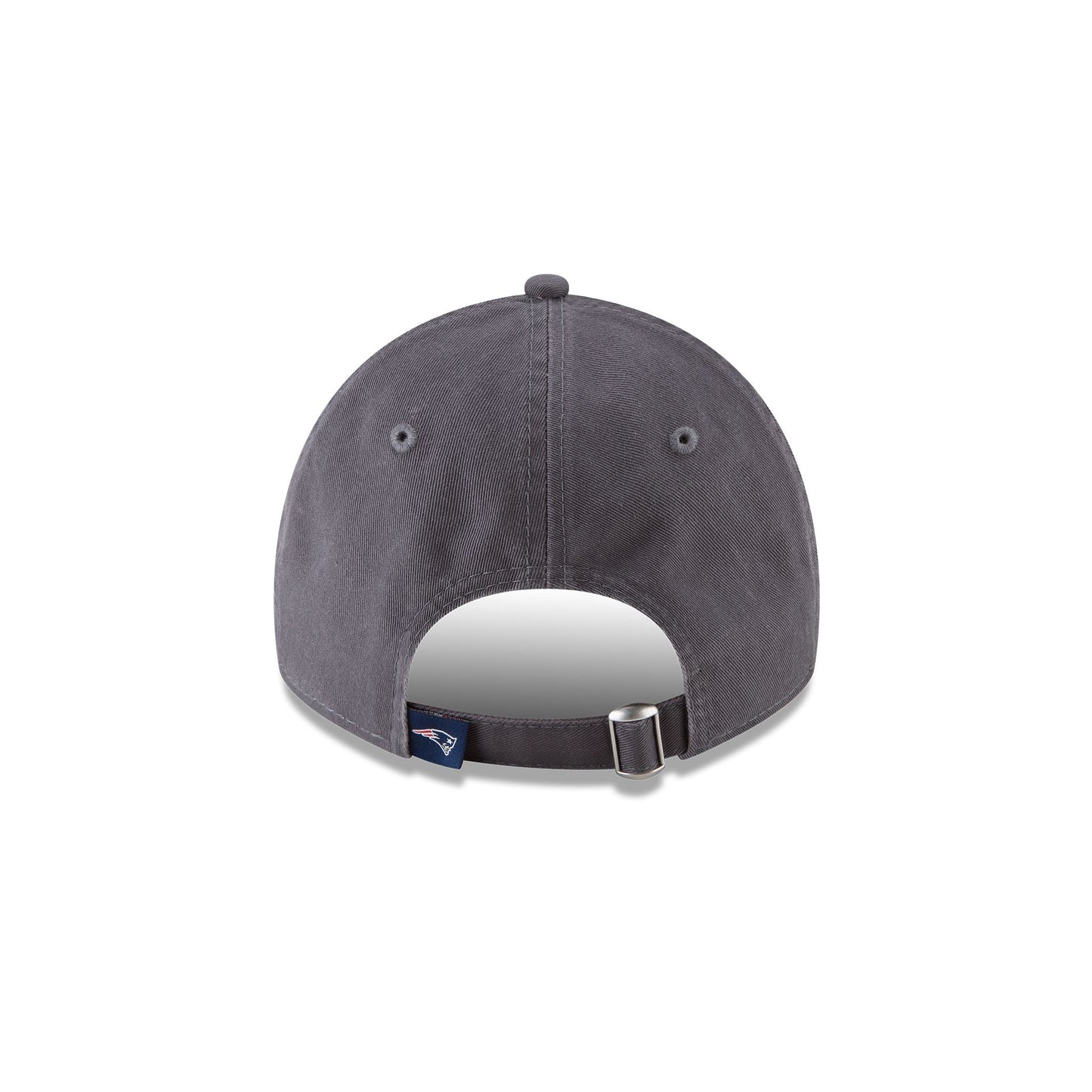 The New England Patriots Core Classic Graphite 9TWENTY Adjustable Cap features an embroidered Patriots logo at the front panels with a woven tab displaying the team logo on a D-Ring closure at the rear.
