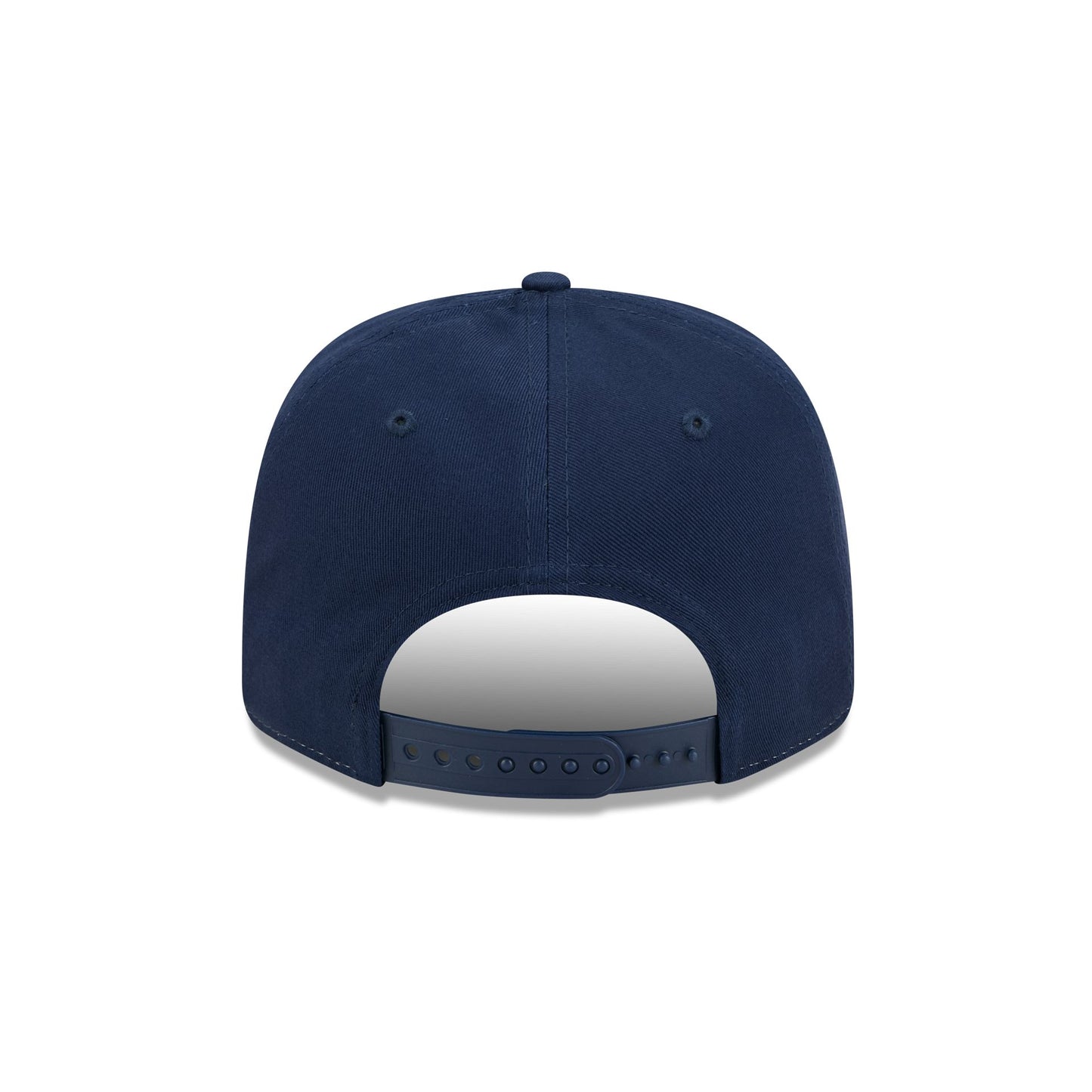 The New England Patriots Split Panel 9SEVENTY Stretch-Snap features an embroidered Patriots logo at the front panel with a split crown construction and a rope at the visor. Additional details include an adjustable stretch-snap closure at the rear and a gray undervisor.