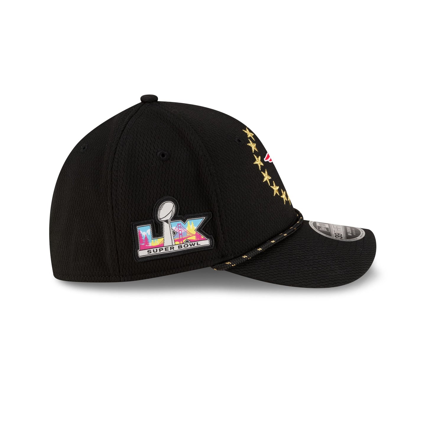 The New England Patriots Super Bowl LX Participation 39THIRTY M-Crown Stretch Fit Cap features an embroidered Patriots logo with stars at the front panels. Additional details include a Super Bowl LX patch at the right-wear side and the NFL Shield at the rear.