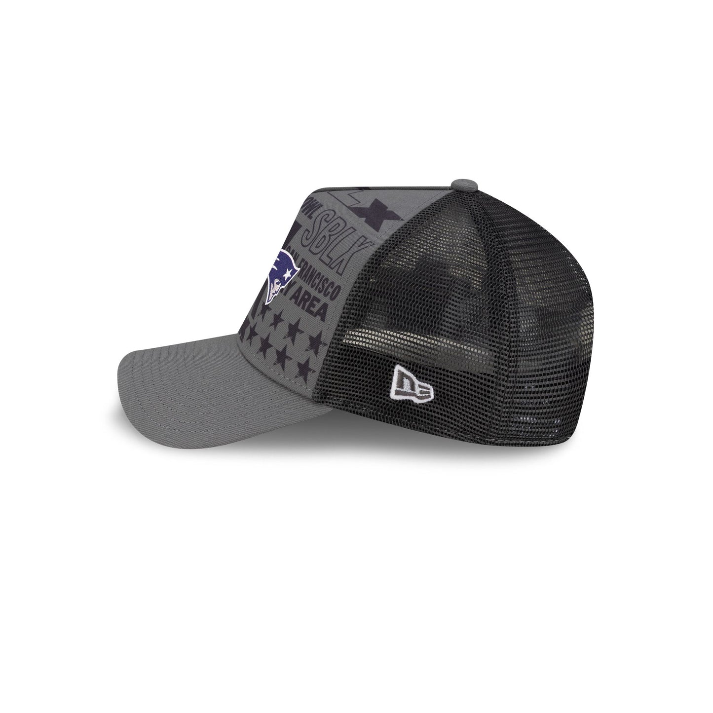 The New England Patriots Super Bowl LX Participation 9FORTY A-Frame Trucker features an embroidered Patriots logo at the front panels against a Super Bowl LX screen-print pattern. Additional details include a Super Bowl LX patch at the right-wear side with the NFL Shield above an adjustable snapback closure at a mesh rear.