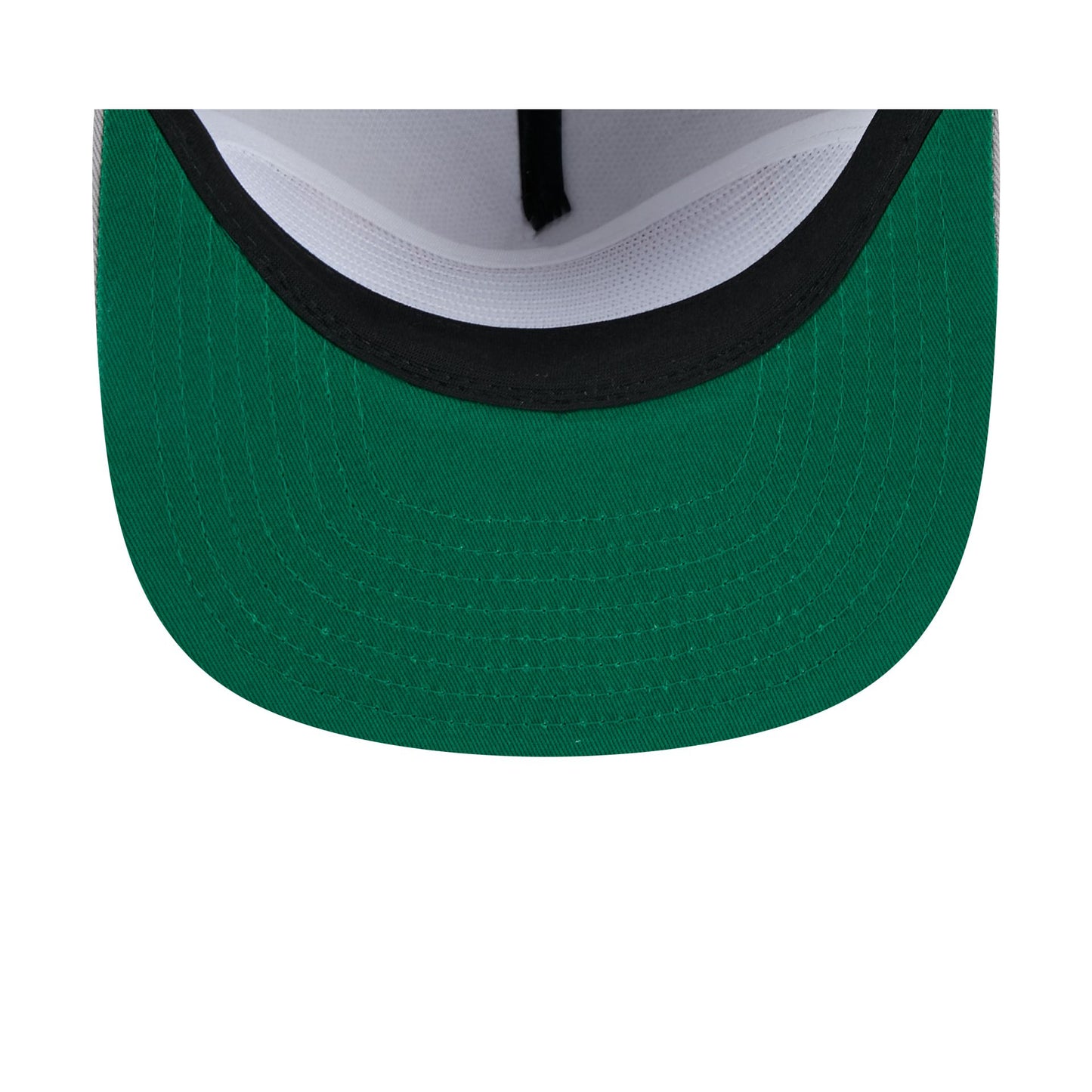 The New England Patriots Vintage Gray Golfer features an embroidered "PROPERTY OF" Patriots wordmark at the front panels with a team logo at the right-wear side and a rope at the visor. Additional details include a snapback closure at the rear and a green undervisor.