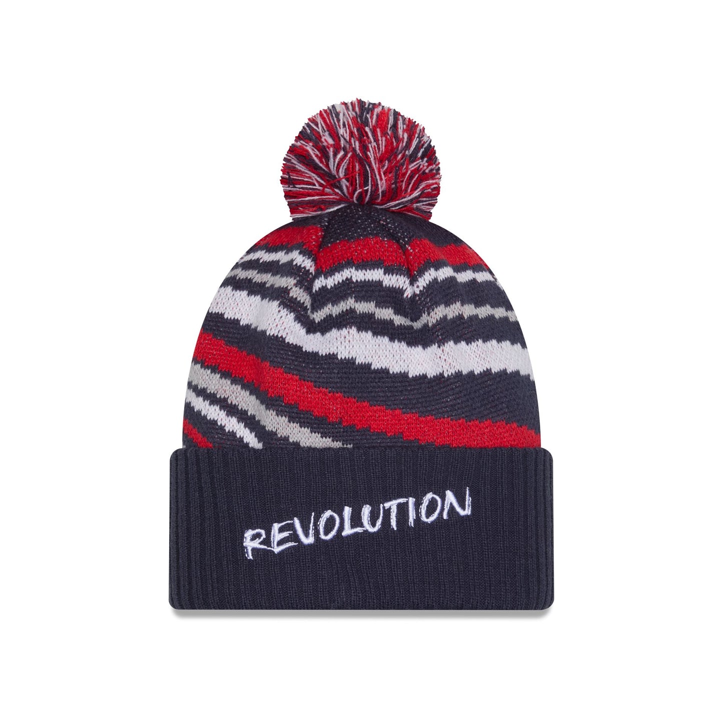 The New England Revolution 2025 Jersey Hook Multicolor Pom Knit Hat features an embroidered Revolution logo at the front cuff with a team wordmark at the rear and a one-time removeable pom.