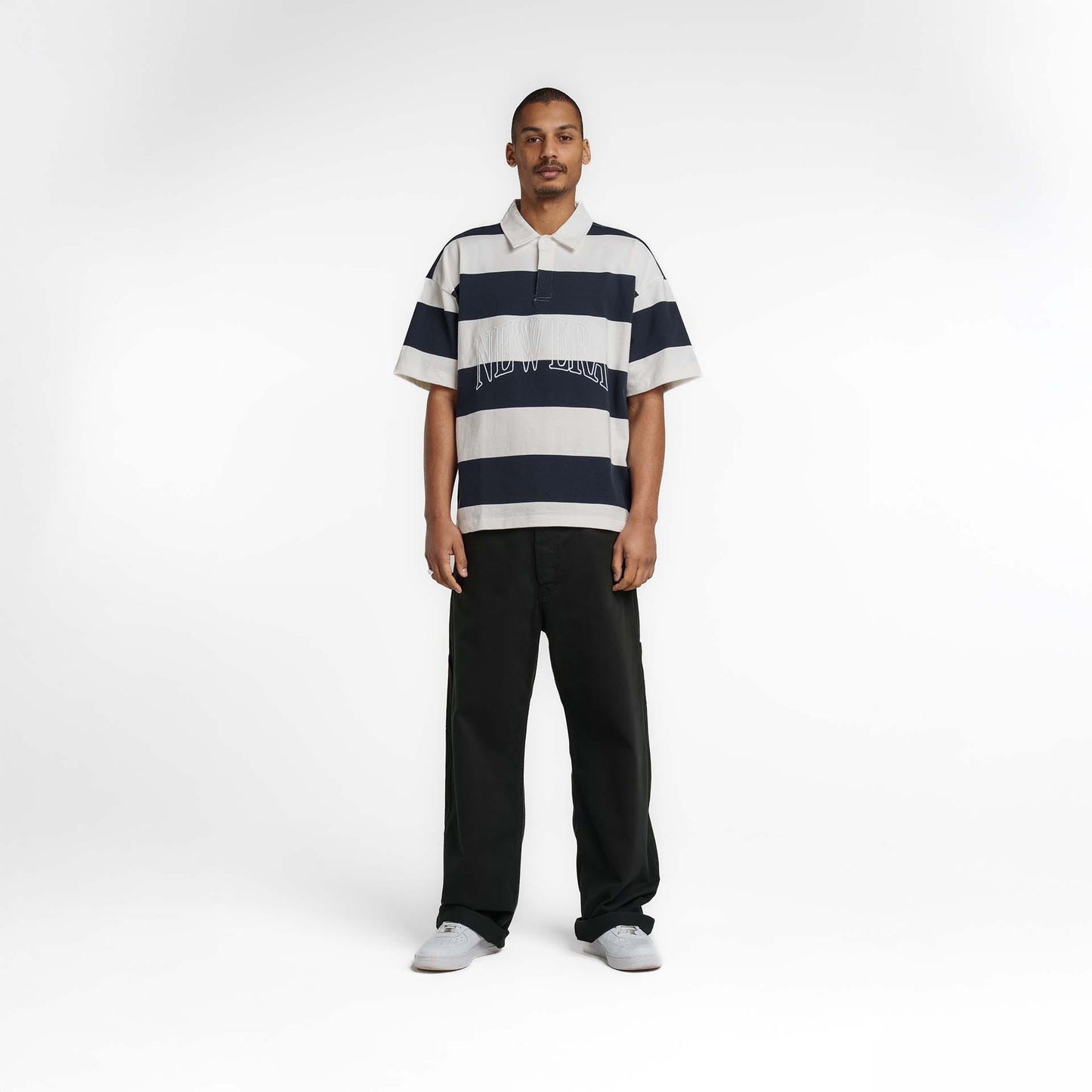The New Era Branded Embroidered Yarn Dye Navy Rugby Shirt features: