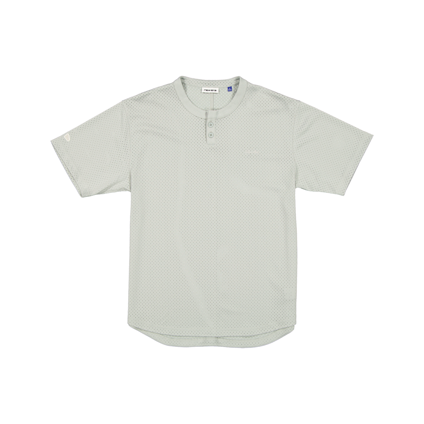 The New Era Branded Galvin 2-Button Mesh Henley Mirage Gray Jersey features:
