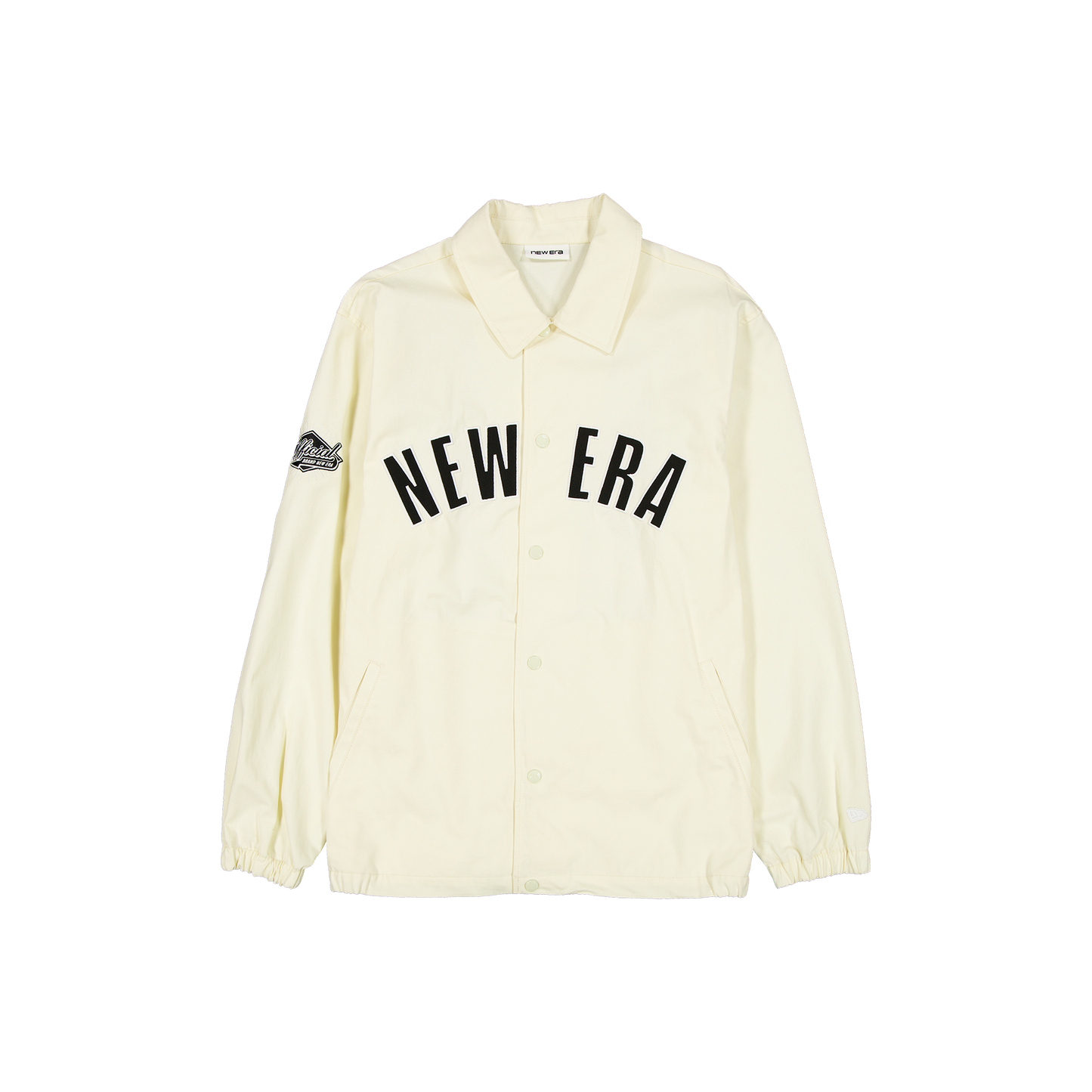 The New Era Branded Twill Applique Chrome White Coaches Jacket features: