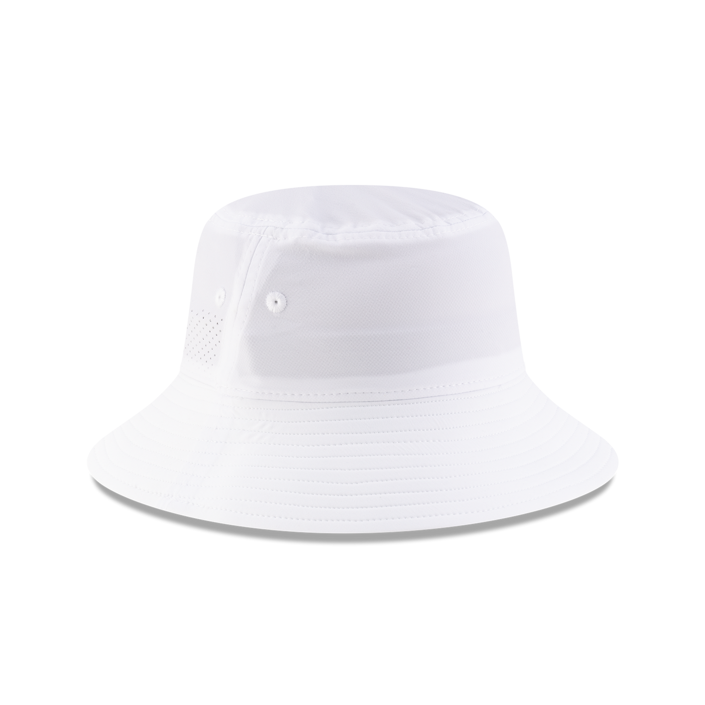 The New Era Branded White Golf Stretch Bucket Hat features:
