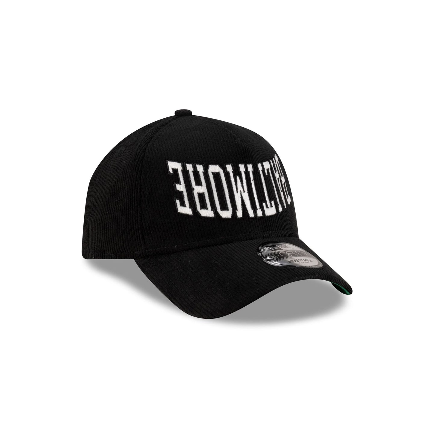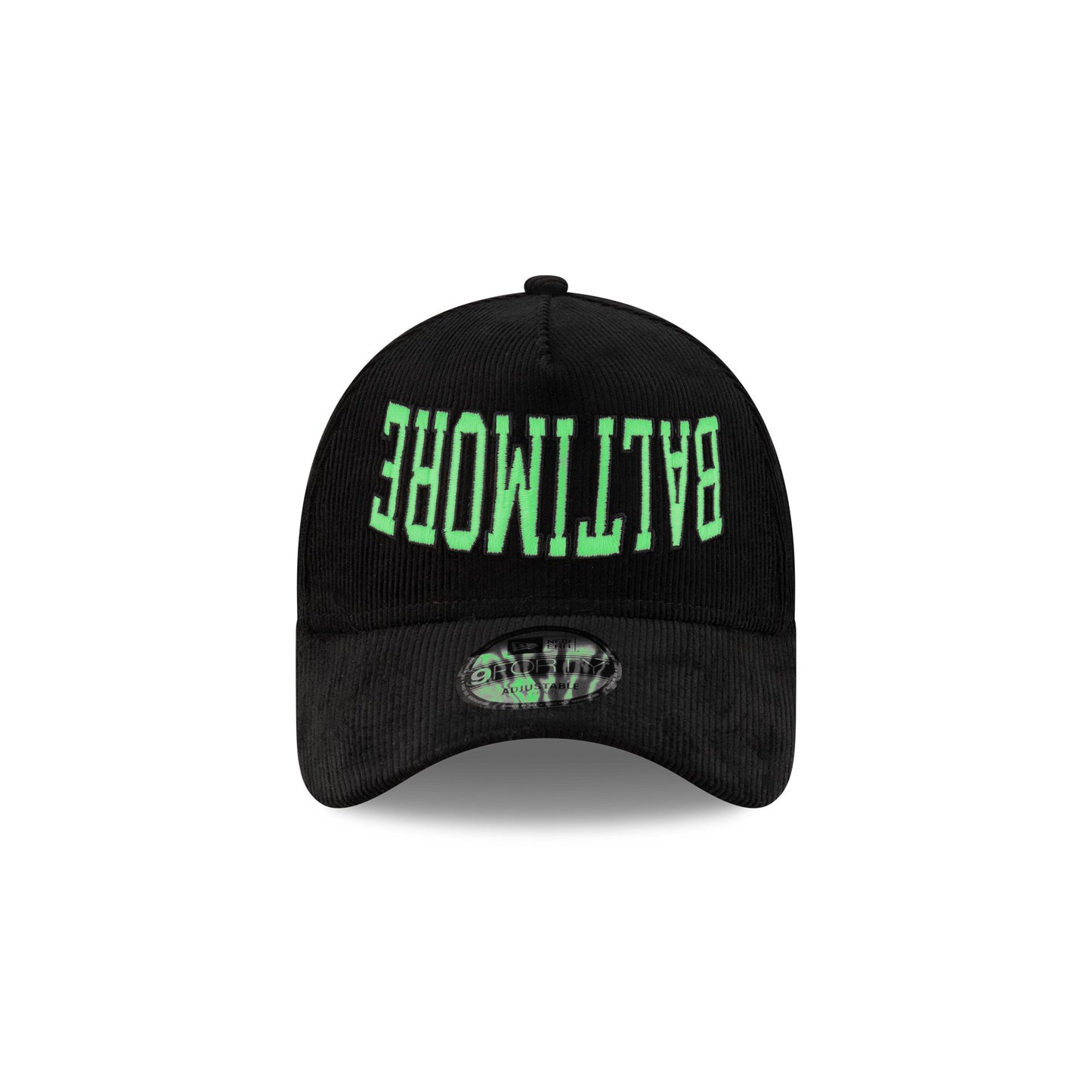 The New Era Cap Baltimore 9FORTY A-Frame Snapback features a glow-in-the-dark embroidered city wordmark at the front panels with a New Era Flag at the left-wear side, a snapback closure at the rear, and a green undervisor.