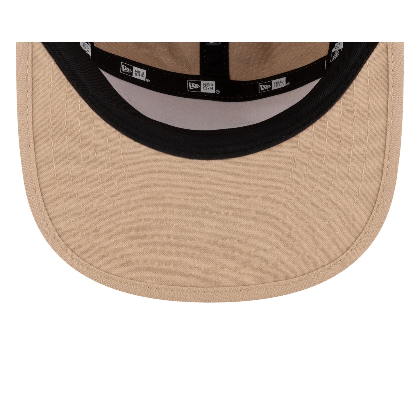 The New Era Cap Beige Label Camper Strapback Cap features an embroidered New Era patch at the front panels with perforated rear panels and a strapback closure at the rear.