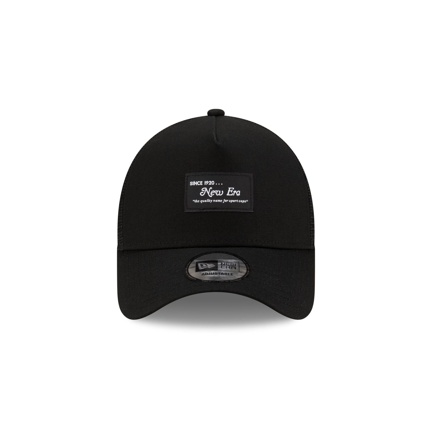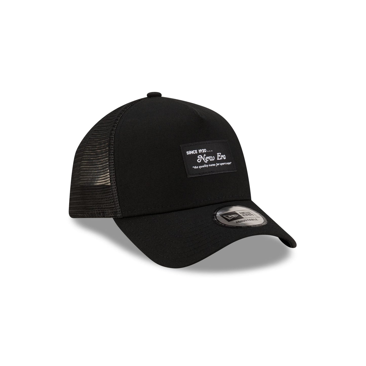 The New Era Cap Black Duck Canvas 9FORTY A-Frame Trucker features a woven New Era patch a the front panels with a matching New Era Flag at the left-wear side and a snapback closure at the rear.