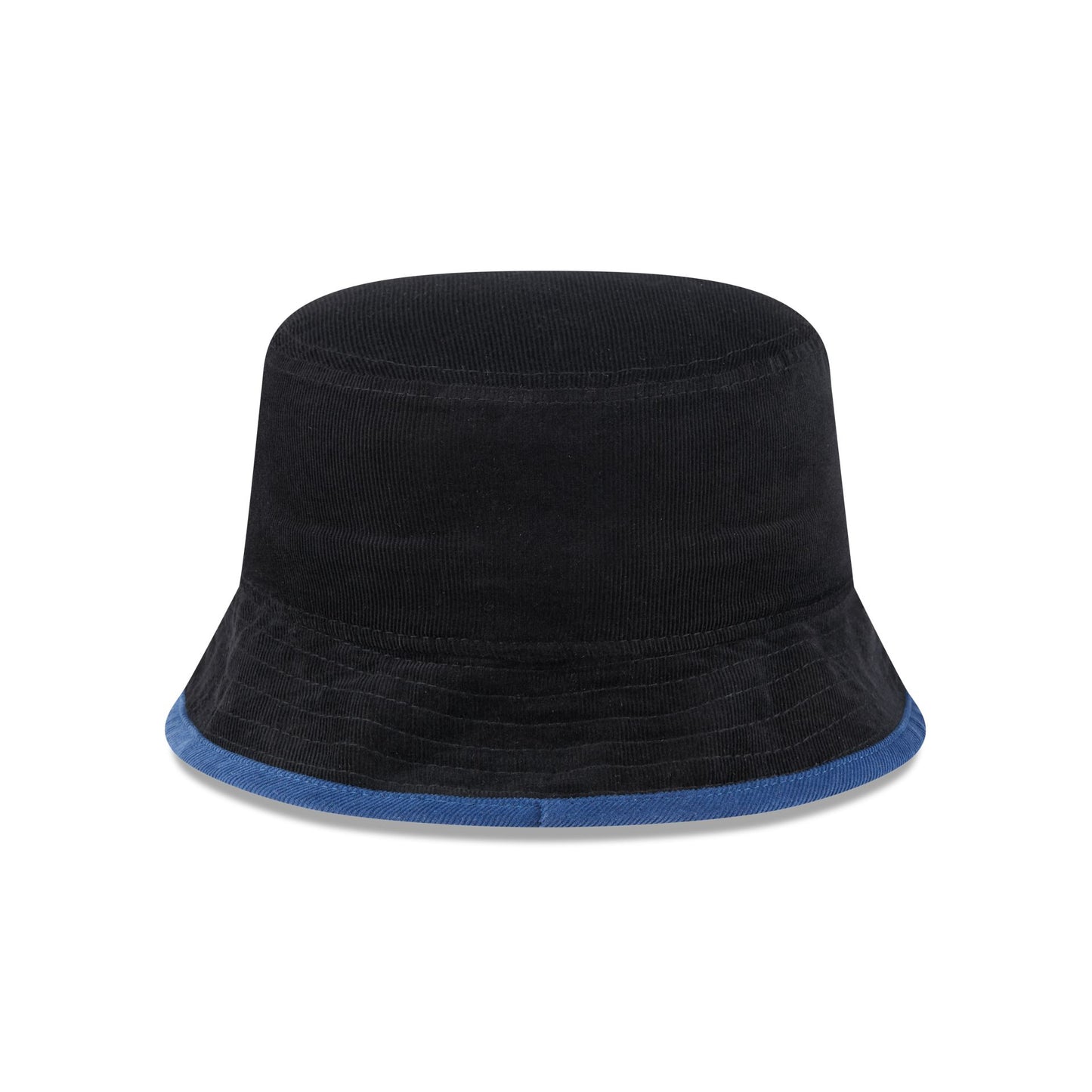 The New Era Cap Black Slate Cord Bucket Hat features a corduroy fabrication, a New Era flag at the left-wear side, and a blue brim.