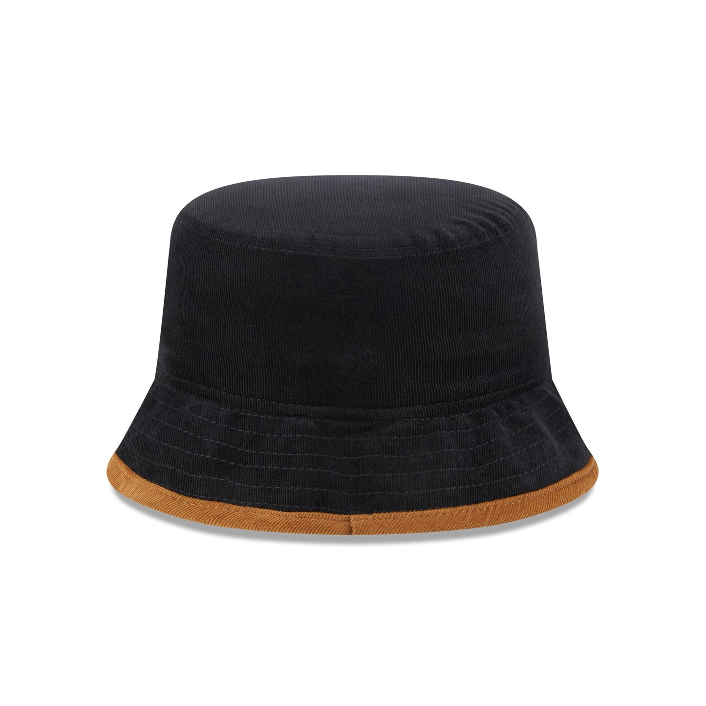 The New Era Cap Black Tiramisu Cord Bucket Hat features a corduroy fabrication, a New Era flag at the left-wear side, and a brown brim.
