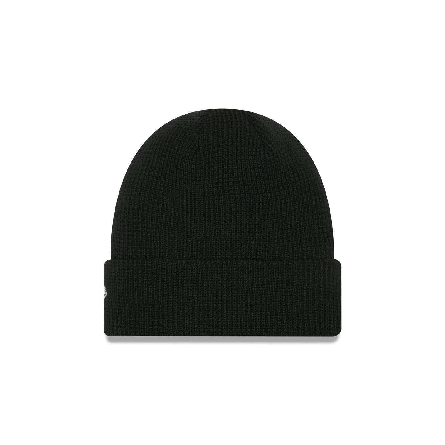 The New Era Cap Black Waffle Knit Beanie features a waffle knit stitch and a New Era flag at the left-wear side.