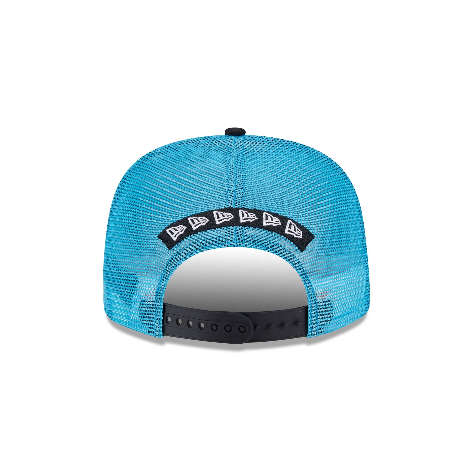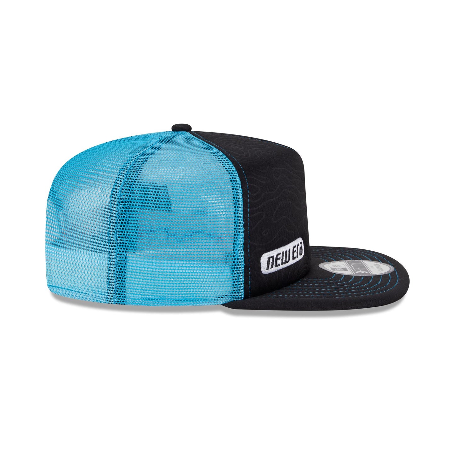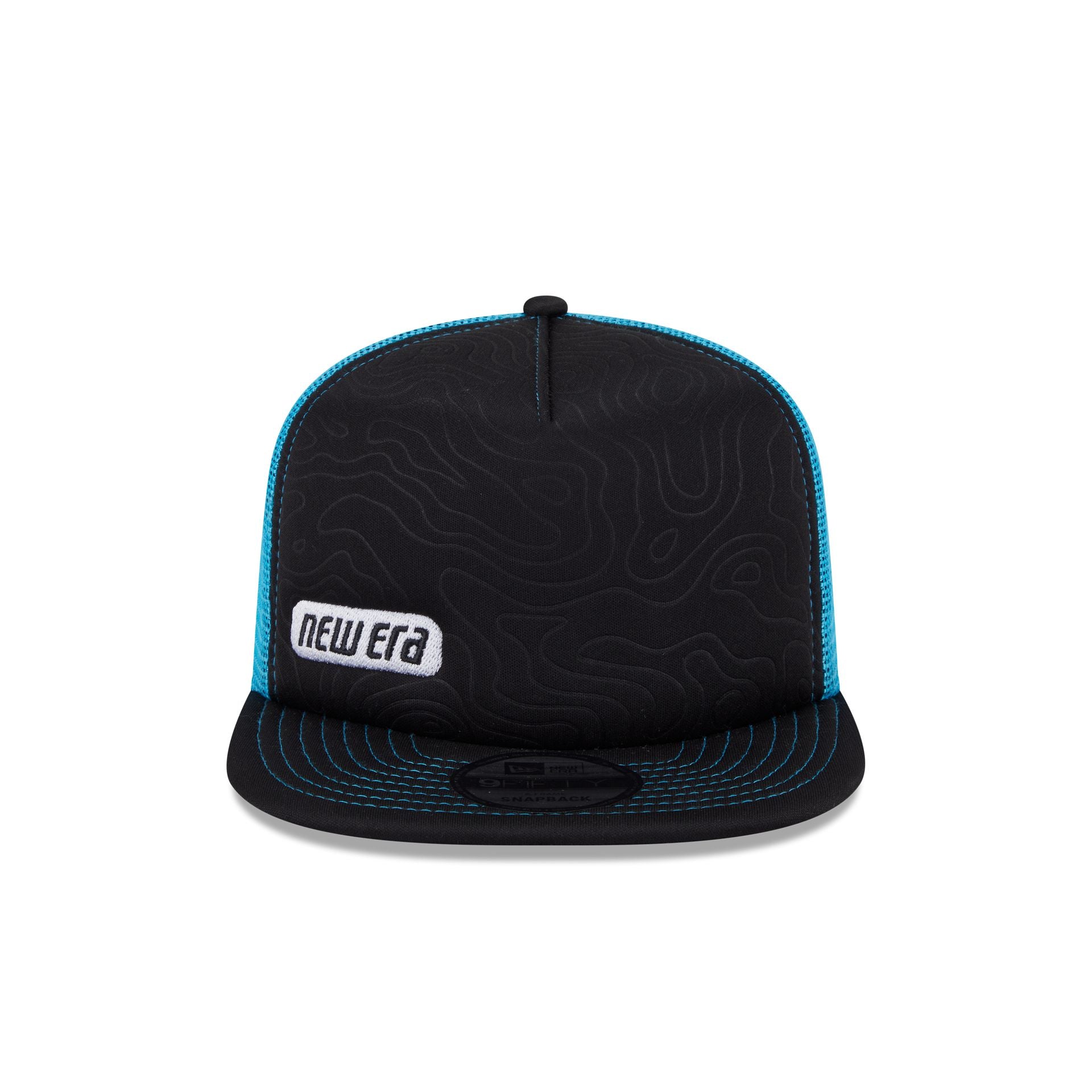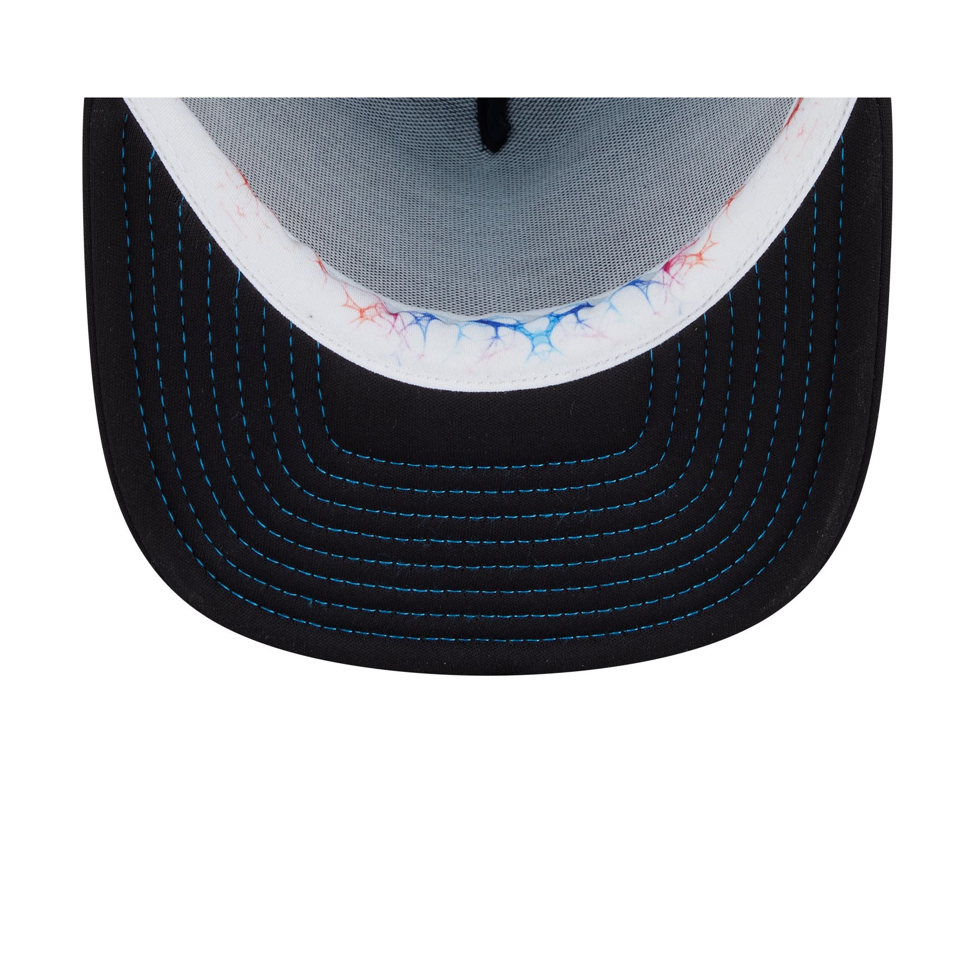 The New Era Cap Blue Wisteria 9FIFTY A-Frame Trucker features an embroidered New Era wordmark at the lower right front panel against a debossed foam fabrication. Additional details include New Era logos above a snapback closure at the rear, a tie dye sweatband, and a black undervisor.