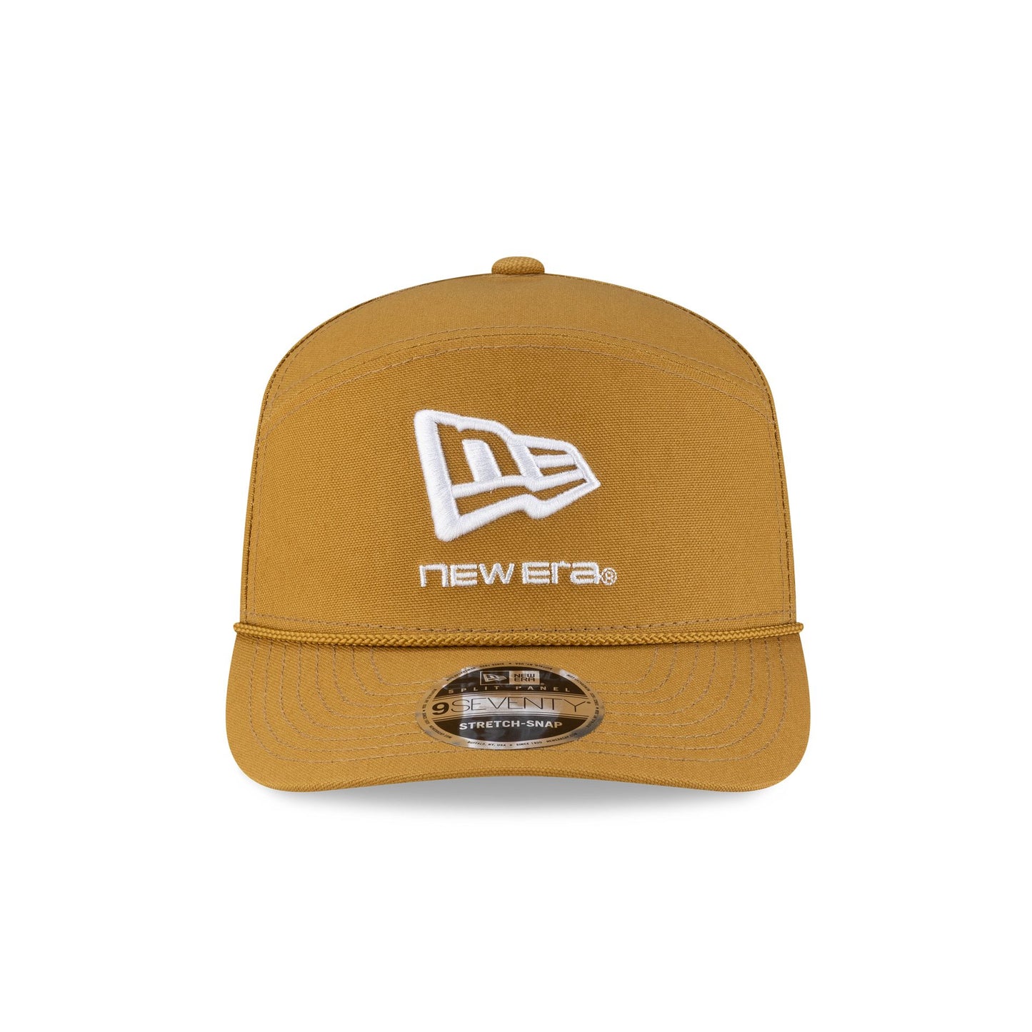The New Era Cap Brown Split Panel 9SEVENTY Stretch-Snap features an embroidered New Era Flag and wordmark at the front panel with an adjustable snapback closure at the rear, a pre-curved visor, and a gray undervisor.