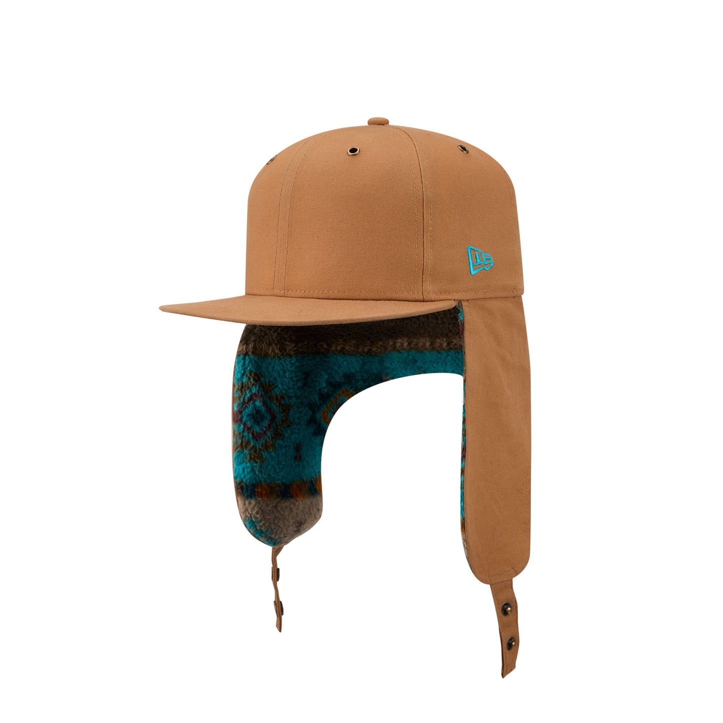 The New Era Cap Canvas Light Bronze Dog Ear 59FIFTY Fitted Cap features a cotton canvas fabrication with an embroidered New Era Flag at the left-wear side and antique brass metal eyelets. Additional details include a printed sherpa interior fabrication with a snap button closure and a bronze undervisor.