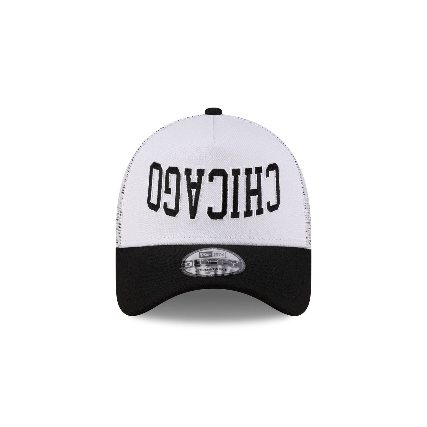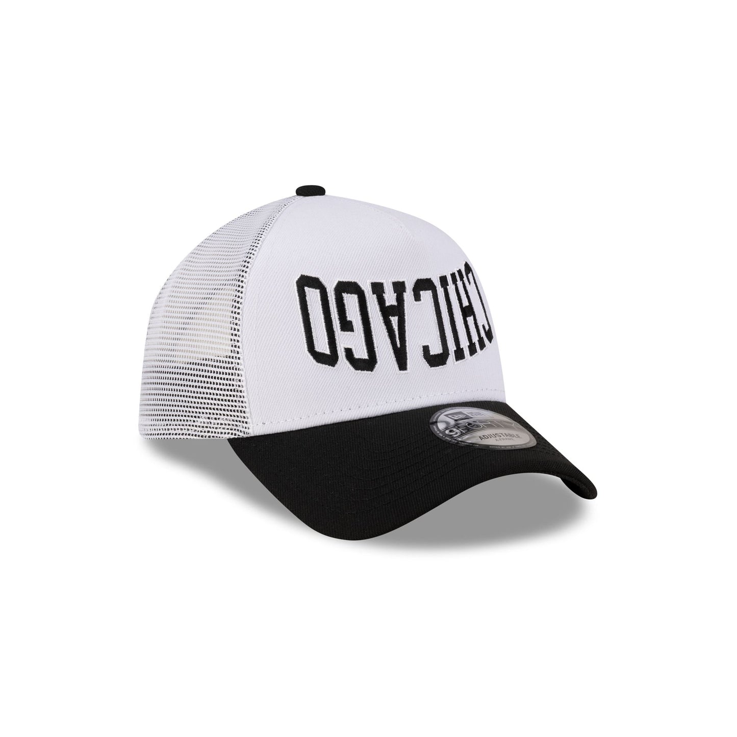 The New Era Cap Chicago 9FORTY A-Frame Trucker features an embroidered city wordmark at the front panels with a New Era Flag at the left-wear side, a snapback closure at the rear, and a black undervisor.
