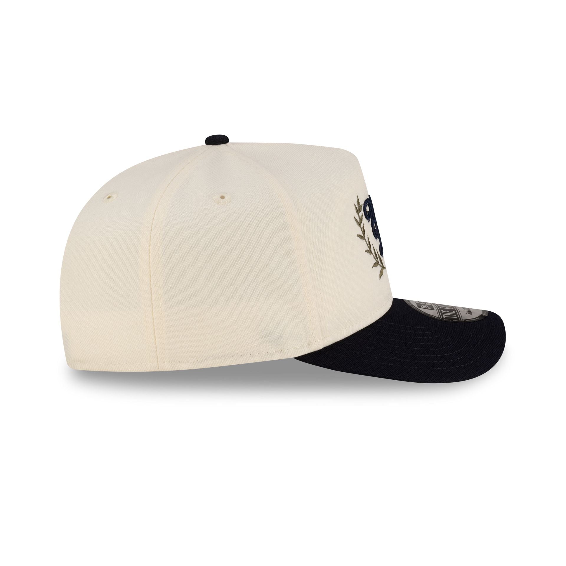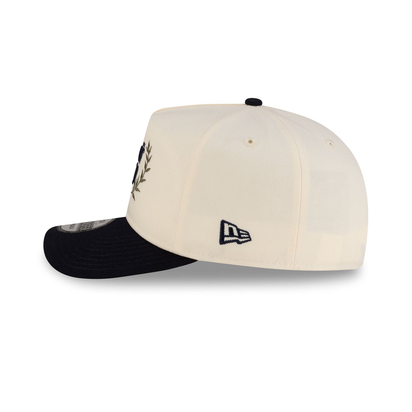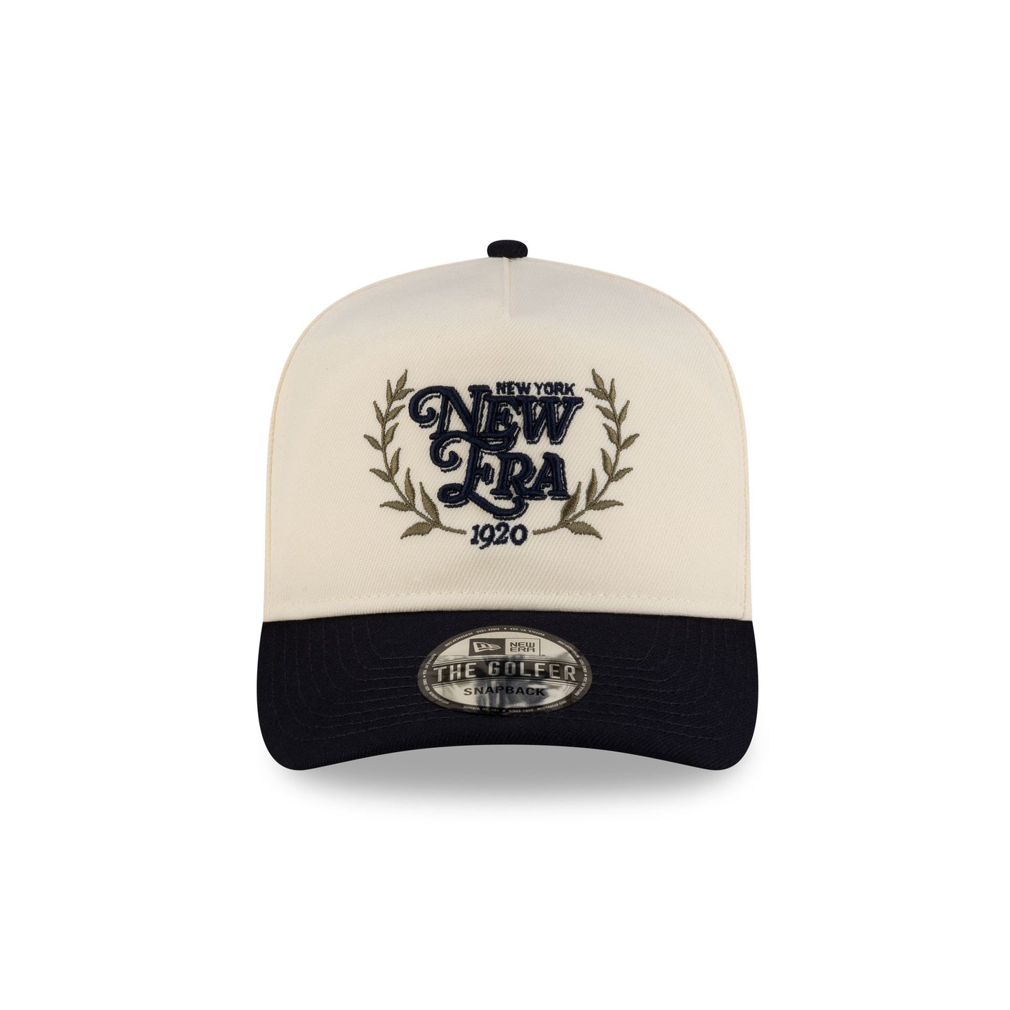 The New Era Cap Cream Pre-Curved Golfer features an embroidered New Era 1920 patch at the front panels with a navy visor and a snapback closure at the rear.