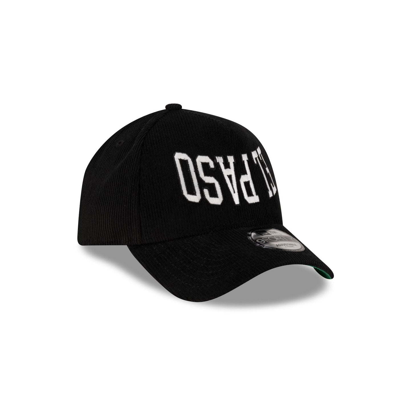 The New Era Cap El Paso 9FORTY A-Frame Snapback features a glow-in-the-dark embroidered city wordmark at the front panels with a New Era Flag at the left-wear side, a snapback closure at the rear, and a green undervisor.