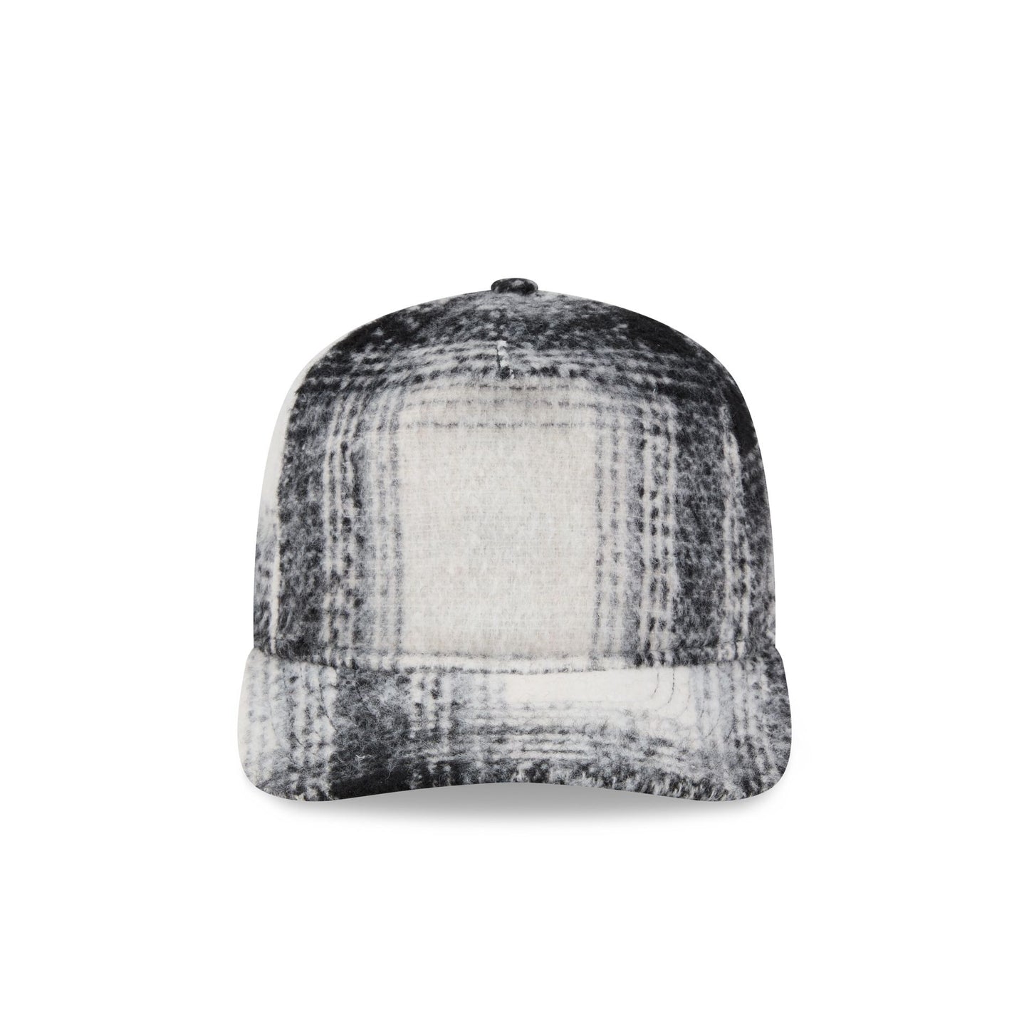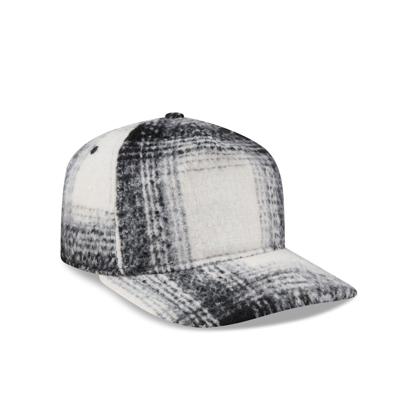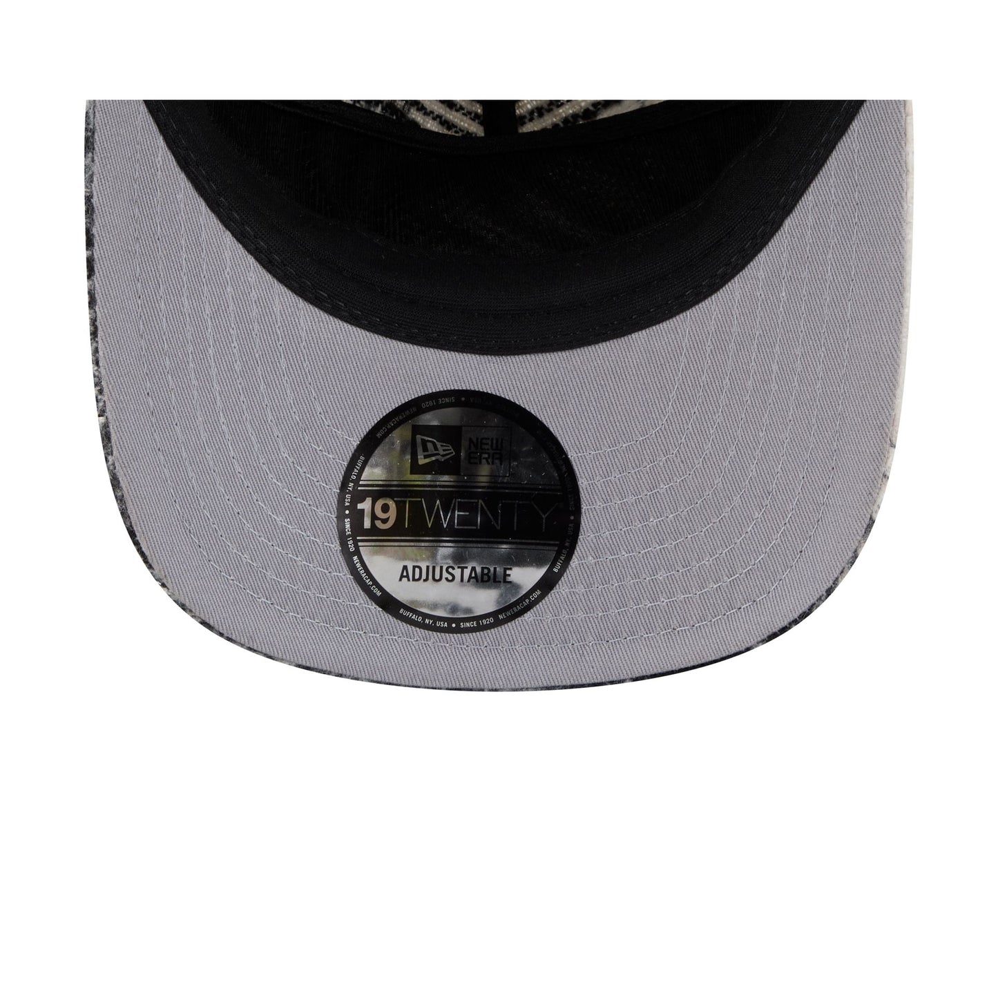 The New Era Cap Flannel Plaid 19TWENTY Adjustable Cap features a black and white oversized flannel plaid fabrication an embroidered New Era Flag at the left-wear side. Additional details include an adjustable leather strap with a metal clamshell buckle closure at the rear and a gray undervisor.