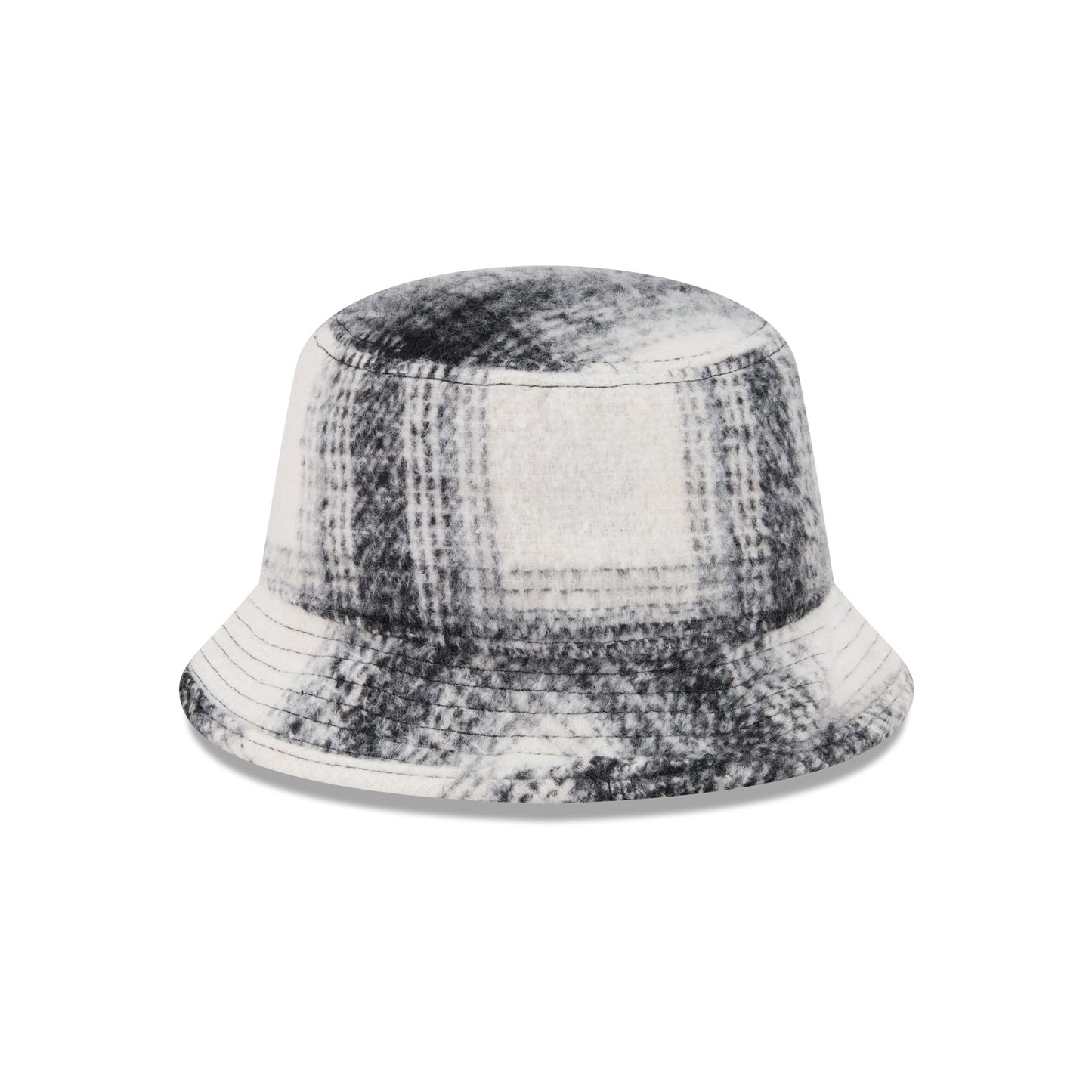The New Era Cap Flannel Plaid Bucket Hat features a black and white oversized flannel plaid fabrication an embroidered New Era Flag at the left-wear side.